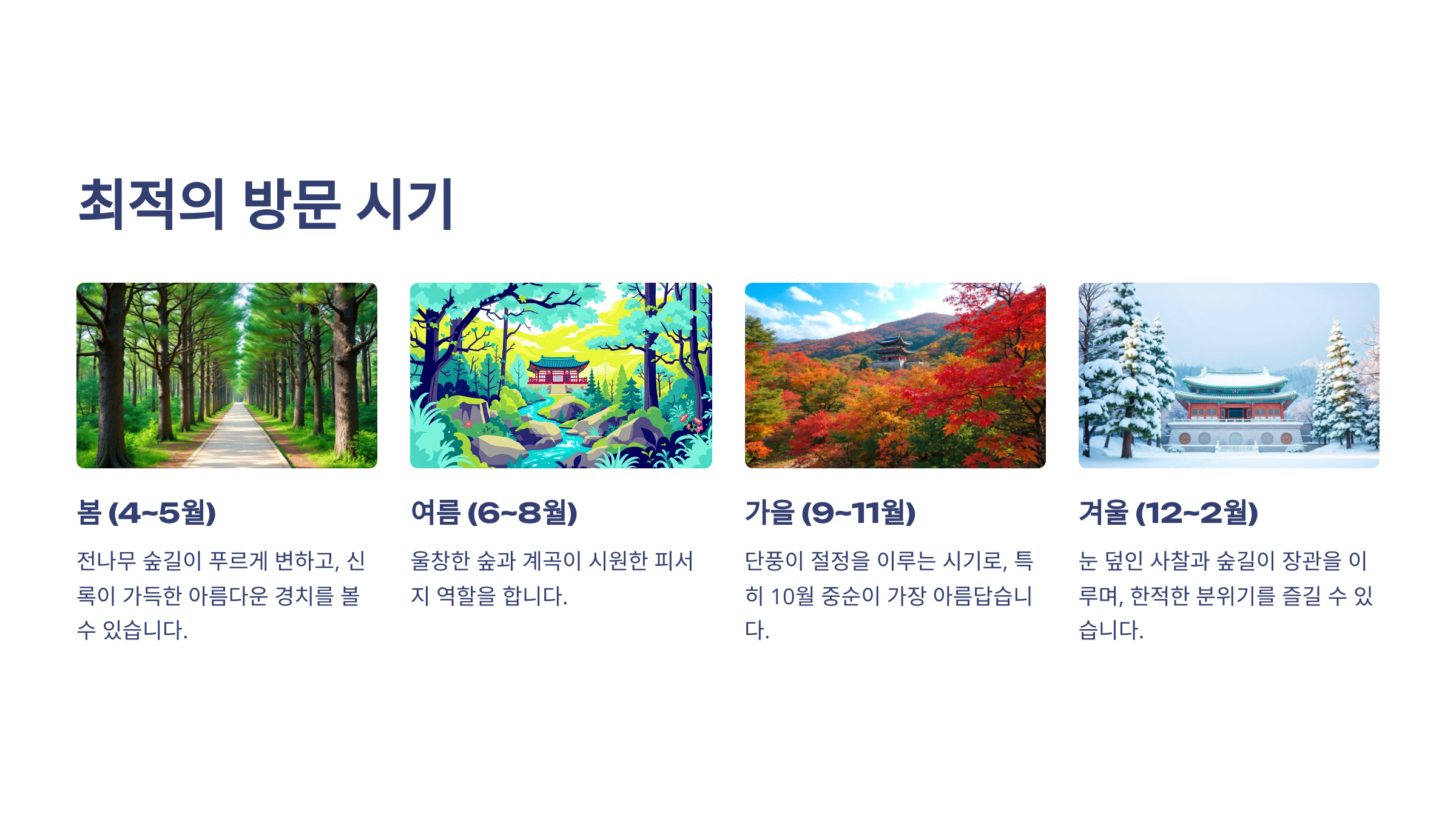 - ❄️ 겨울(12~2월): 눈 덮인 사찰과 숲길이 장관을 이루며, 한적한 분위기를 즐길 수 있어요.