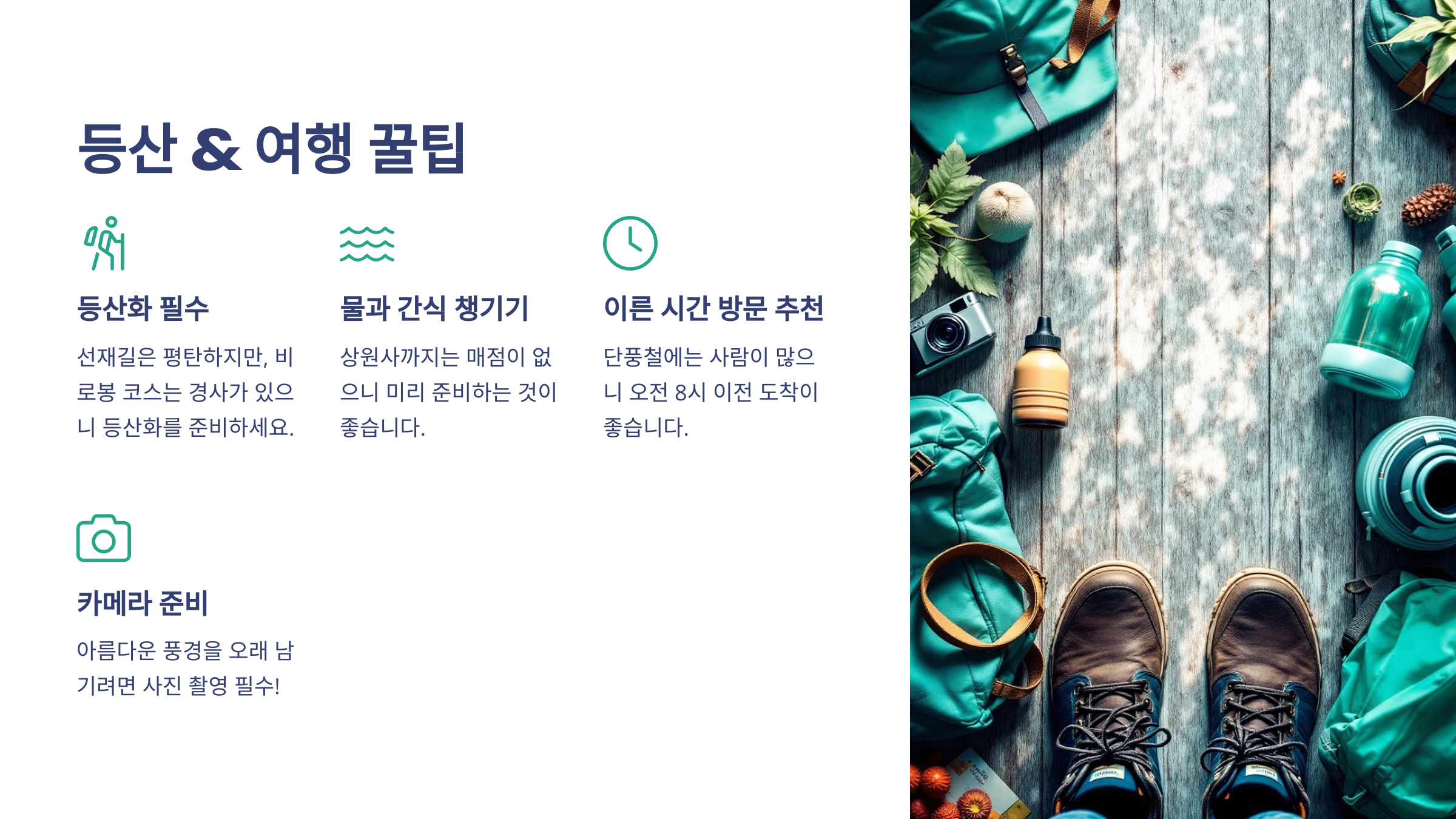 💡 특히 가을 단풍철에는 사람이 많아 미리 일정과 준비물을 체크하는 게 좋아요! 🍁