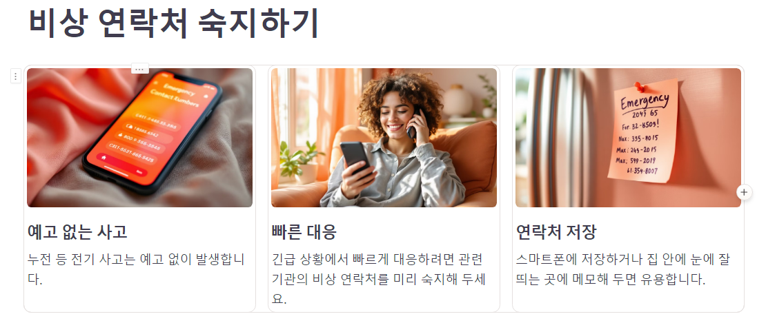 누전 등 전기 사고는 예고 없이 발생합니다. 긴급 상황에서 빠르게 대응하려면 관련 기관의 비상 연락처를 미리 숙지해 두세요.