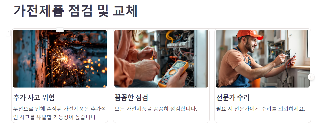 누전 사고를 예방하려면 가정 내 전기 설비를 정기적으로 점검해야 합니다. 특히 오래된 건물이나 전선의 노후화가 의심될 경우 전문 점검을 통해 문제를 미리 해결할 수 있습니다.