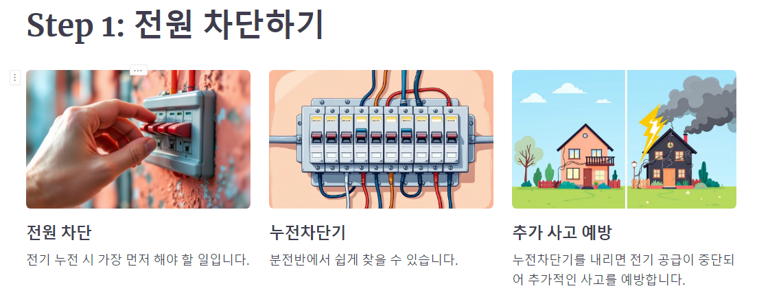 - 누전 상황에서는 반드시 고무장갑이나 절연 장치를 사용해 작업하세요.