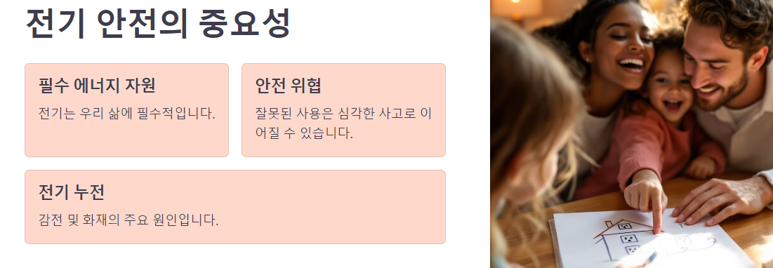 가정 내 누전 사고는 가족 모두에게 영향을 미칠 수 있습니다. 특히 어린이, 노약자, 반려동물 등 전기에 민감한 대상이 있는 경우 빠르게 대피시키고 주의를 당부해야 합니다.