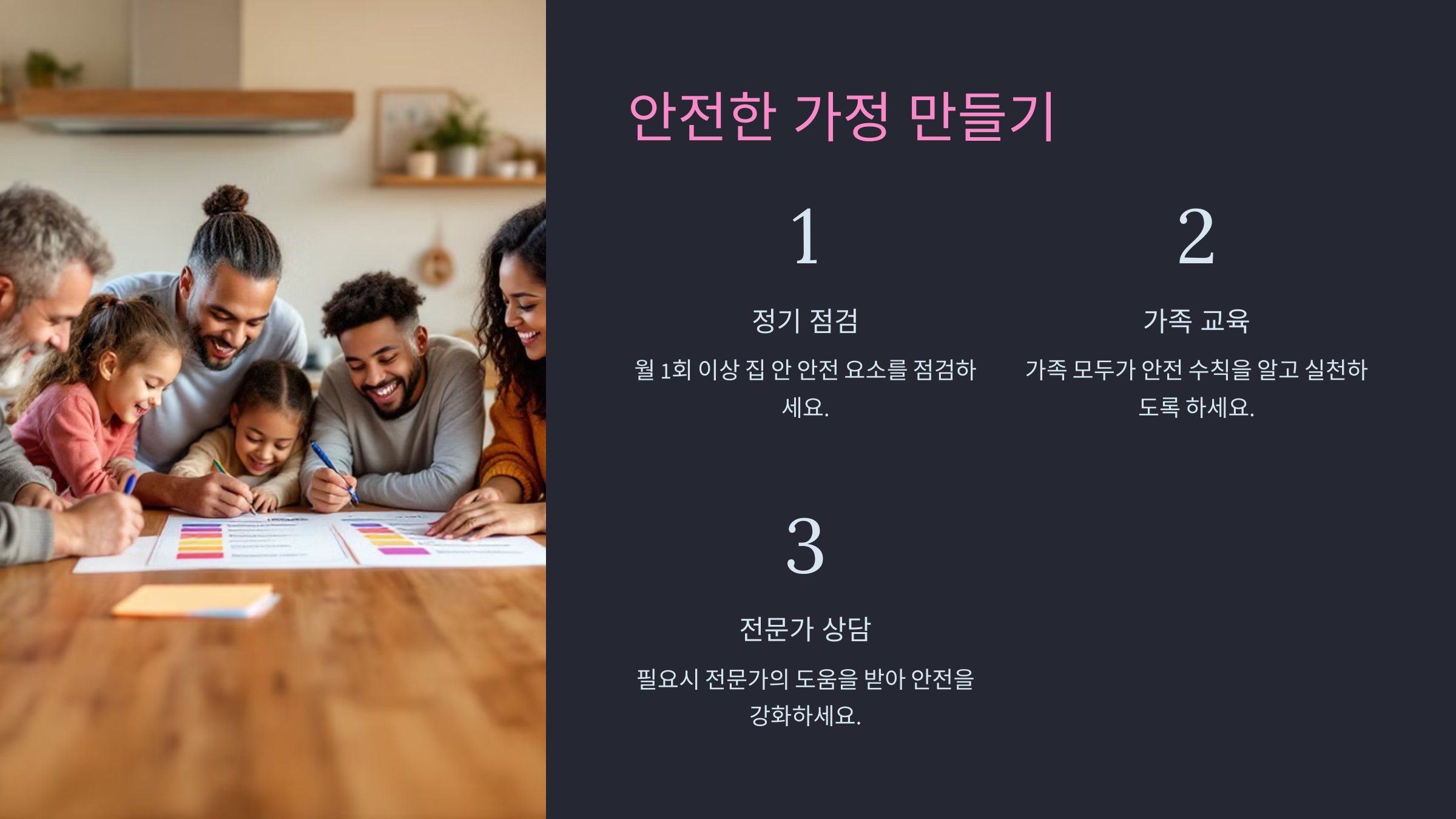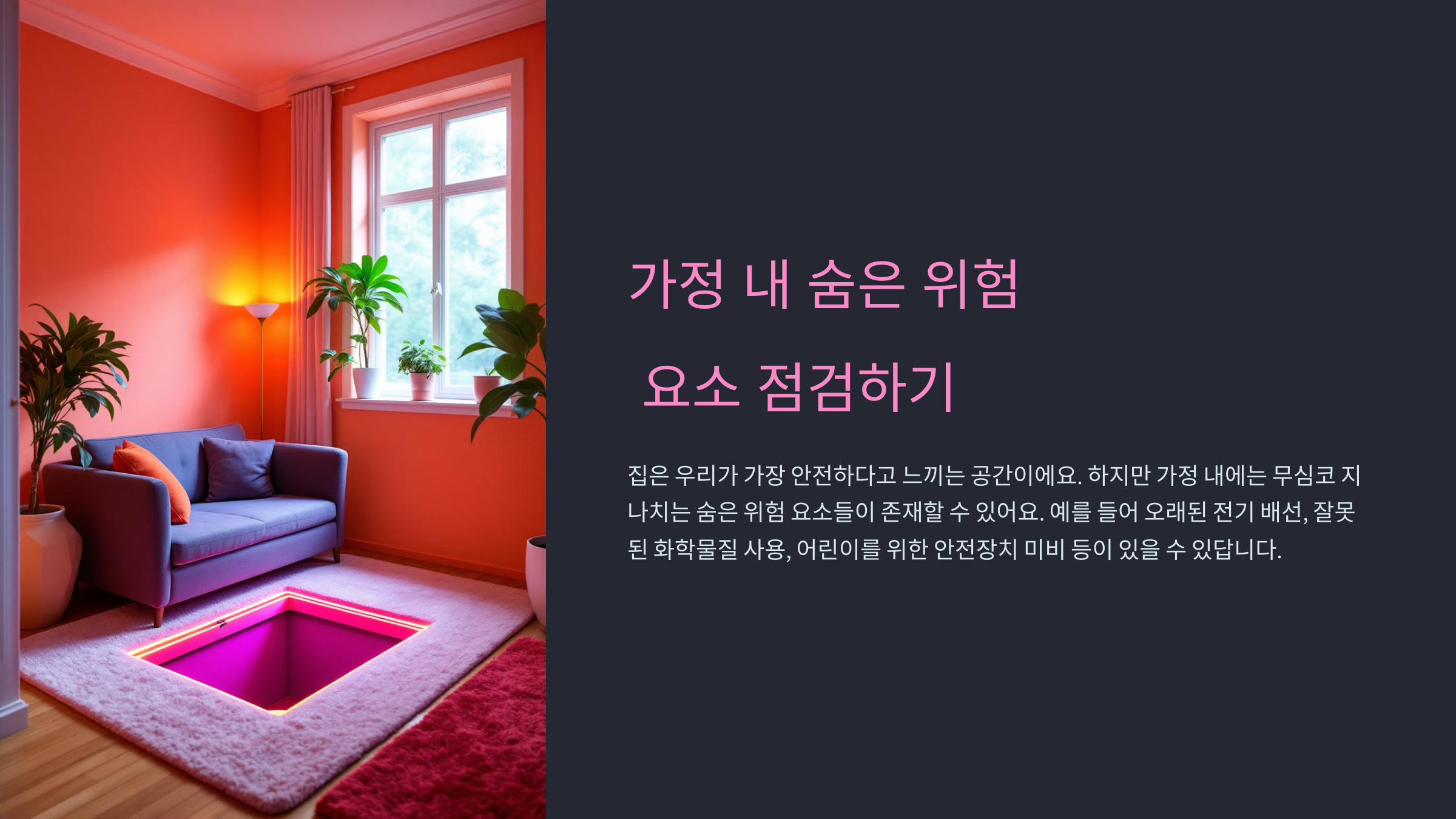 오늘은 가정 내 숨어 있는 위험 요소들을 꼼꼼히 점검하고, 미리 대비하는 방법에 대해 알아보려 해요. 전기와 화재, 어린이 안전, 낙상 예방까지 다양한 위험 요소를 세부적으로 살펴볼 예정이에요. 내가 생각했을 때, 이러한 정보는 집에서 안전을 최우선으로 생각하는 분들에게 꼭 필요한 내용일 거예요.
