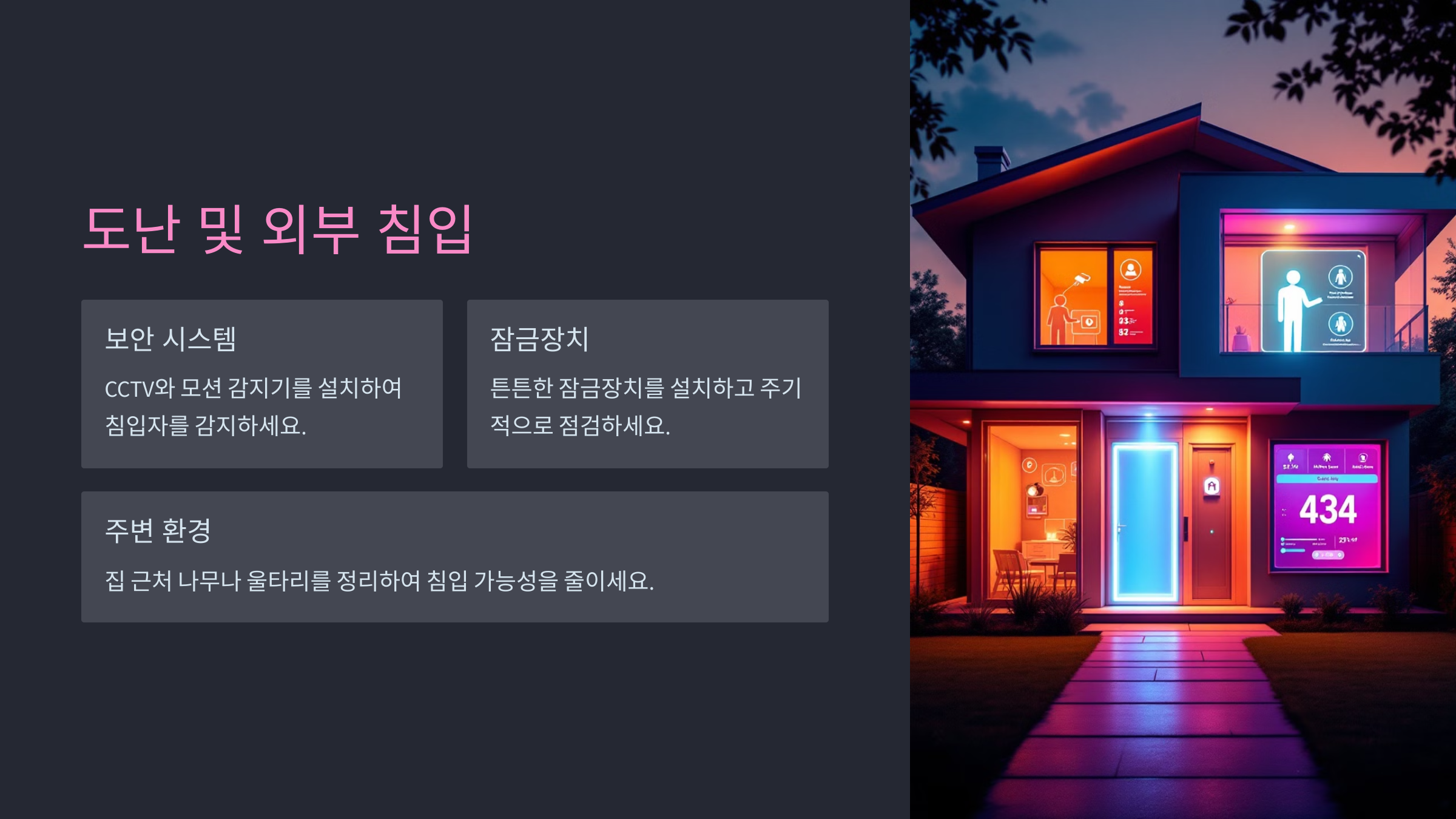 도난과 외부 침입은 집에서 가장 우려되는 위협 중 하나예요. 이를 예방하기 위해서는 방범창과 보안 시스템을 활용하는 것이 좋아요. 특히 CCTV와 모션 감지기를 설치하면 침입자를 감지하고 즉각적으로 대응할 수 있어요.