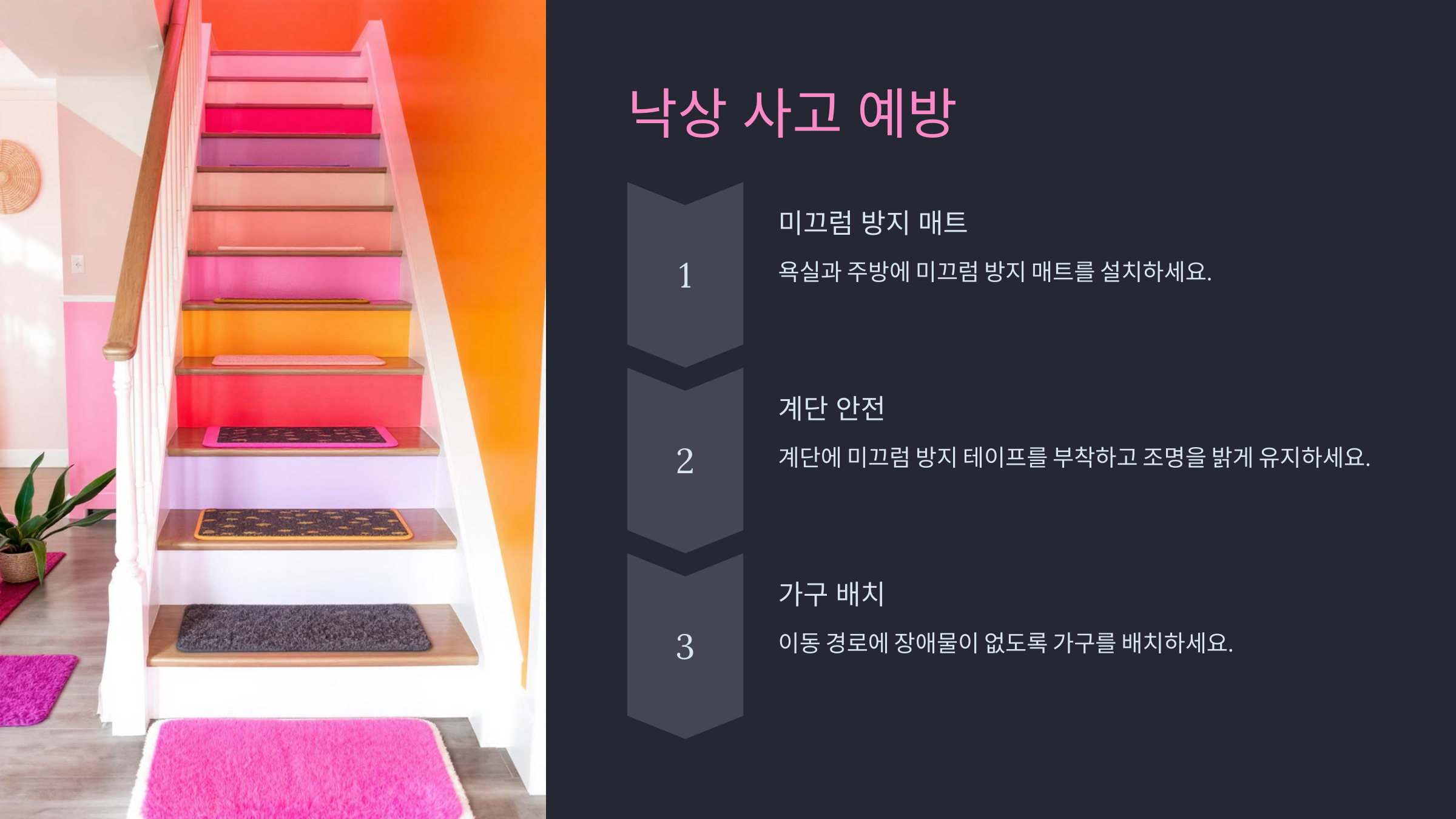 계단은 낙상의 위험이 가장 높은 공간 중 하나예요. 계단에 미끄럼 방지 테이프를 부착하고, 조명이 충분히 밝은지 확인해야 해요. 어두운 계단은 시야를 방해해 사고를 유발할 수 있답니다. 또한, 난간이 견고하게 설치되어 있는지도 반드시 점검해야 해요.