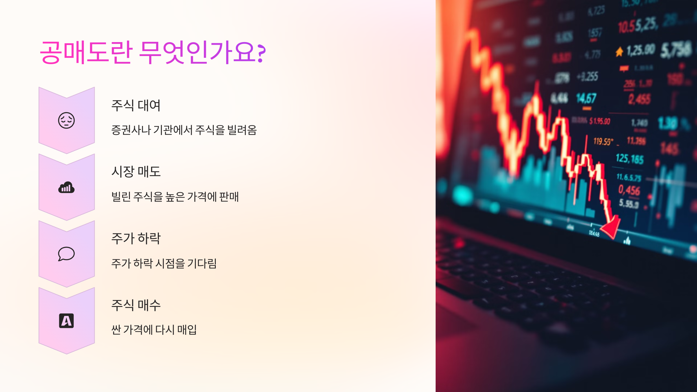 공매도는 주가가 하락할 거라고 예상될 때 이익을 보기 위한 투자 전략이에요. 주식을 직접 가지고 있지 않아도, 증권사에서 주식을 '빌려서' 먼저 판 다음 나중에 싼 값에 되사서 갚는 구조죠. 📉