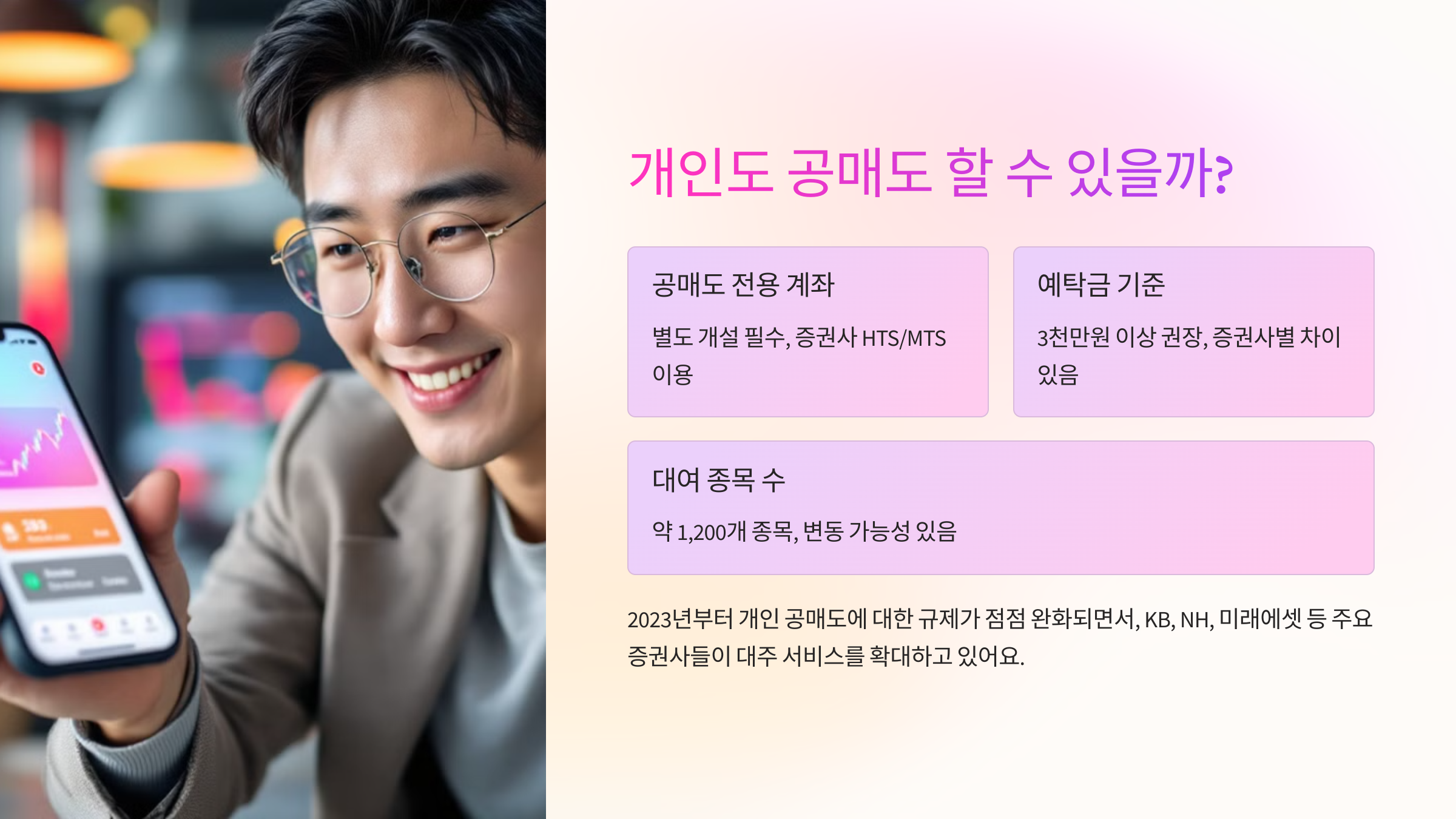 우리나라에서는 '공매도=기관만의 무기'라는 인식이 강하지만, 최근에는 개인도 참여할 수 있는 길이 열리고 있어요. 다만 조건이 존재하니, 바로 다음 섹션에서 확인해볼게요! 🔍