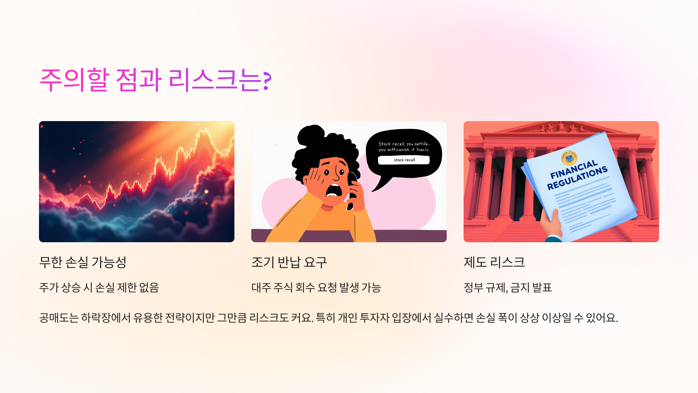 그리고 공매도는 주가가 상승하면 손실이 무제한으로 커질 수 있기 때문에 손절라인 설정이 필수예요. 감정적 투자보다 냉정한 판단이 중요해요. 😤