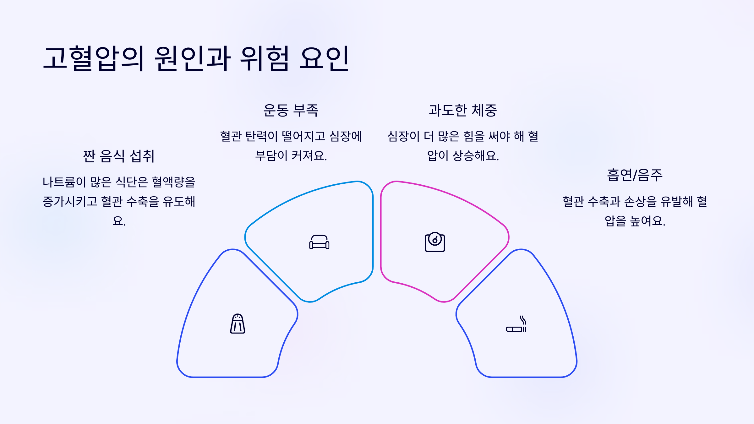 가장 흔한 원인은 짠 음식 섭취예요. 나트륨이 많은 식단은 혈액량을 증가시키고 혈관 수축을 유도해서 혈압을 올려요. 또 운동 부족, 과도한 체중, 흡연, 음주도 혈관 건강에 악영향을 줘요. 이 모든 요소는 고혈압 위험을 높이는 주요한 생활습관이에요.