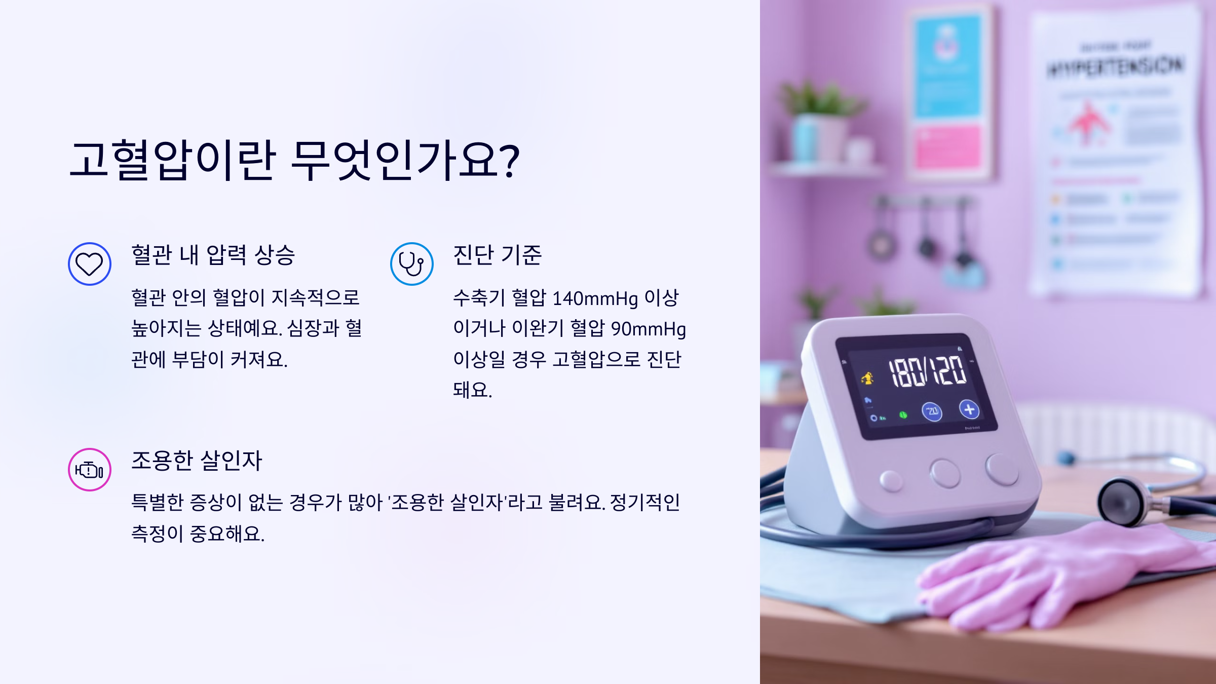 고혈압은 혈관 안의 혈압이 지속적으로 높아지는 상태를 말해요. 쉽게 말해, 심장이 혈액을 내보낼 때 혈관 벽에 가해지는 압력이 지나치게 높다는 뜻이에요. 이 압력이 높아지면 심장과 혈관 모두에 부담이 커지고, 장기적으로 심혈관계 질환으로 이어질 수 있어요.