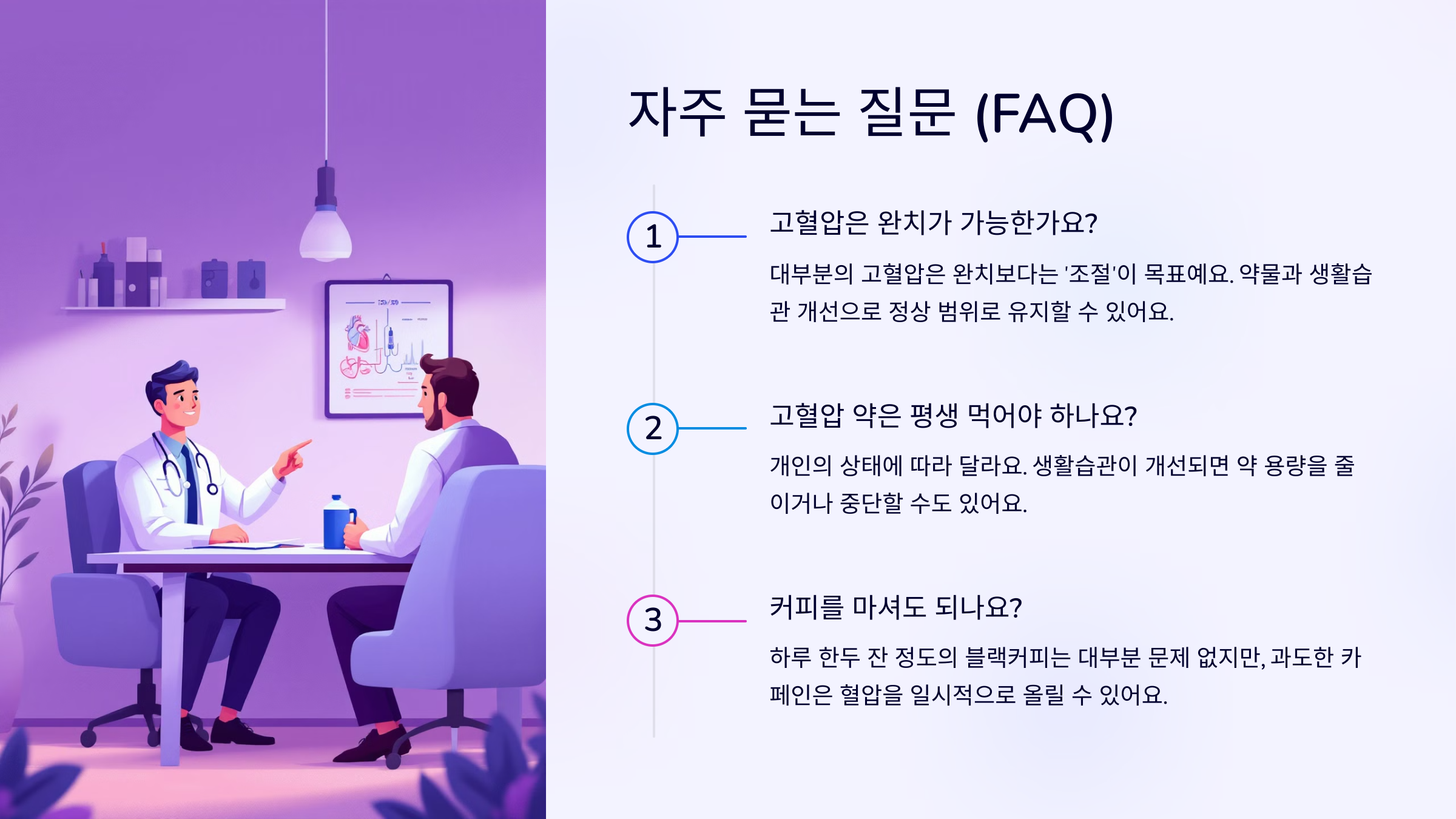 작은 실수라도 반복되면 결국 고혈압 조절에 방해가 되니, 지금까지 소개한 건강 습관들을 잘 체크하고 실천해보세요. 이제 마지막으로 자주 묻는 고혈압 관련 질문들을 FAQ로 정리해드릴게요! 📚