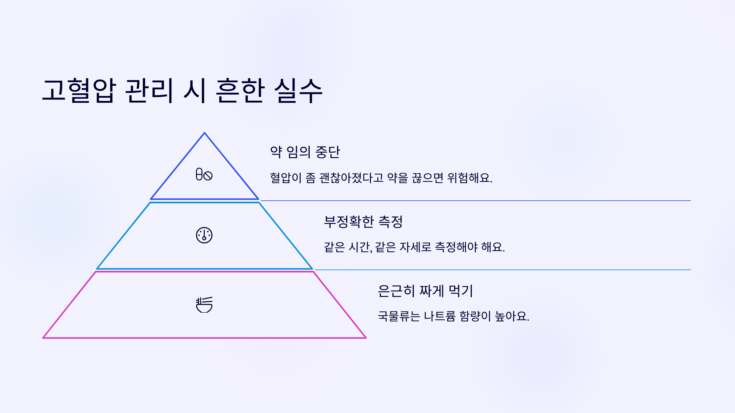 스트레스와 수면을 잘 관리하는 것만으로도 고혈압 약을 줄이거나, 복용 시 효과를 높이는 데 큰 도움이 돼요. 다음은 고혈압 관리에서 흔히 저지르는 실수와 오해를 정리해볼게요! ⚠️