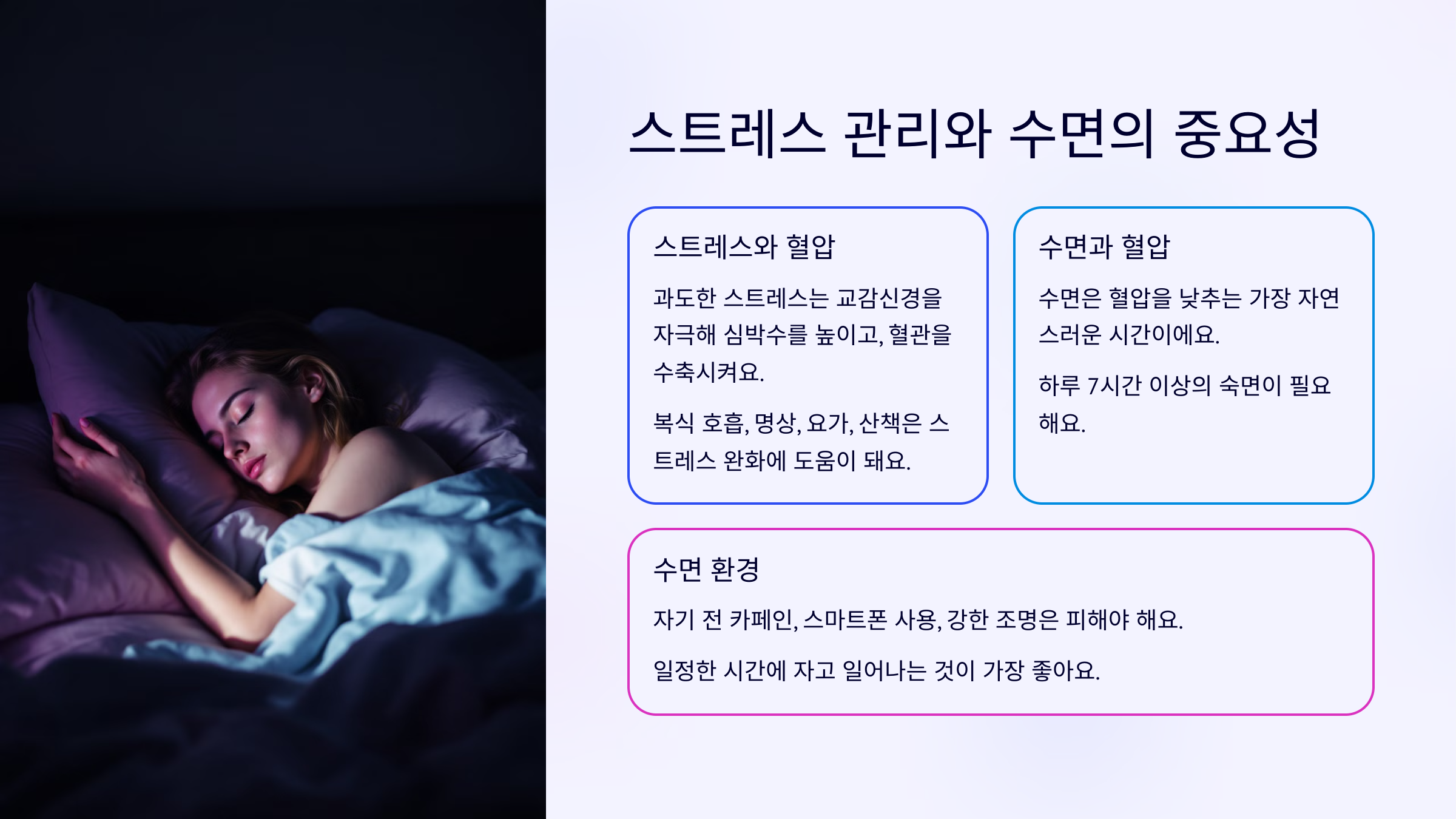 고혈압은 단순히 식습관이나 운동만으로 조절되는 질병이 아니에요. 스트레스와 수면의 질 역시 혈압에 큰 영향을 줘요. 과도한 스트레스는 교감신경을 자극해 심박수를 높이고, 혈관을 수축시키며 혈압을 상승시켜요. 만성 스트레스 상태는 고혈압의 주요 원인이 될 수 있어요.