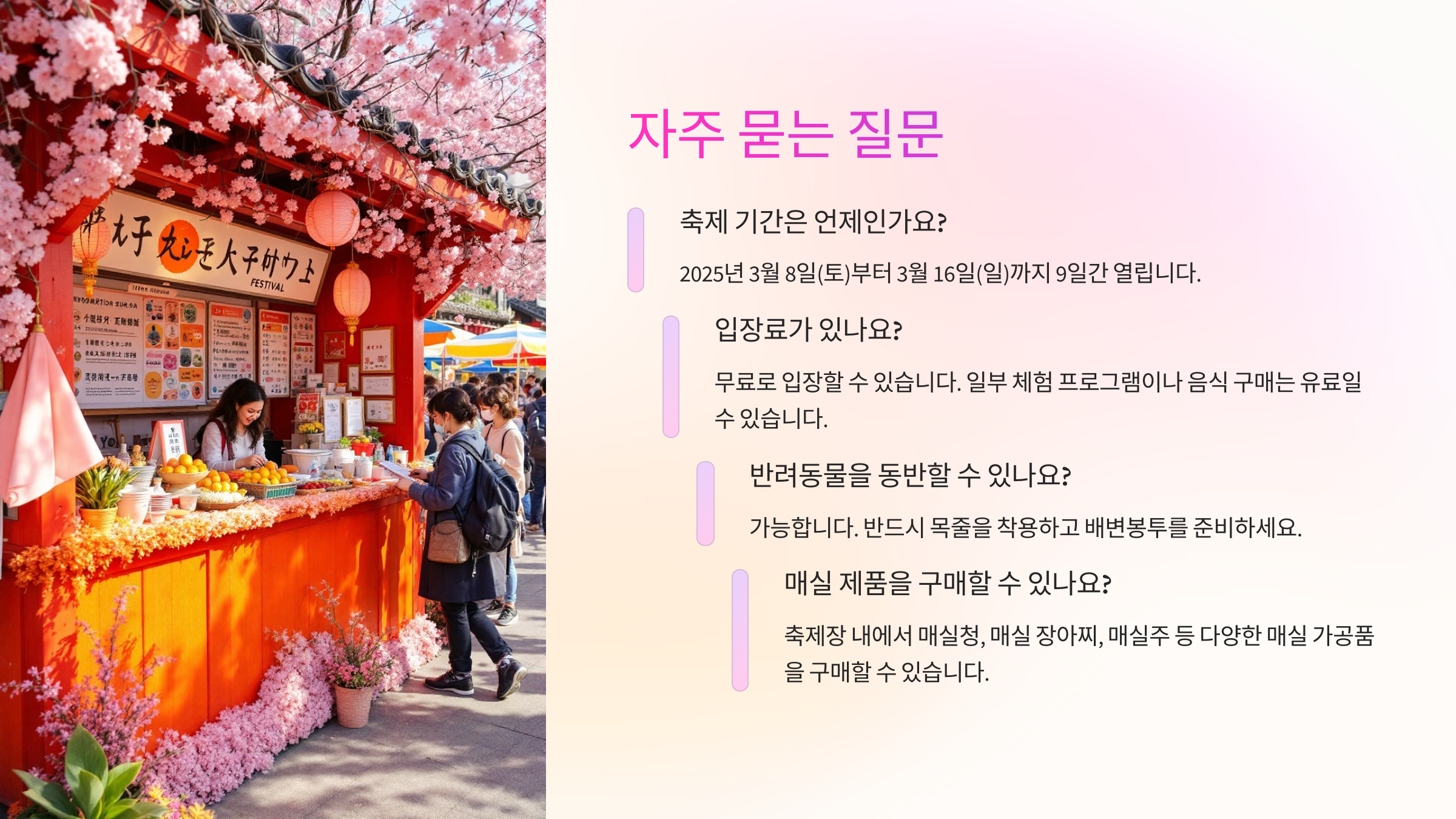 행사장 내에서는 전통 공연, 체험 프로그램, 매실 가공품 판매 등 다양한 프로그램이 운영될 거야. 올해는 매화 테마 포토존과 야간 조명 전시도 추가될 예정이라 더욱 기대돼!