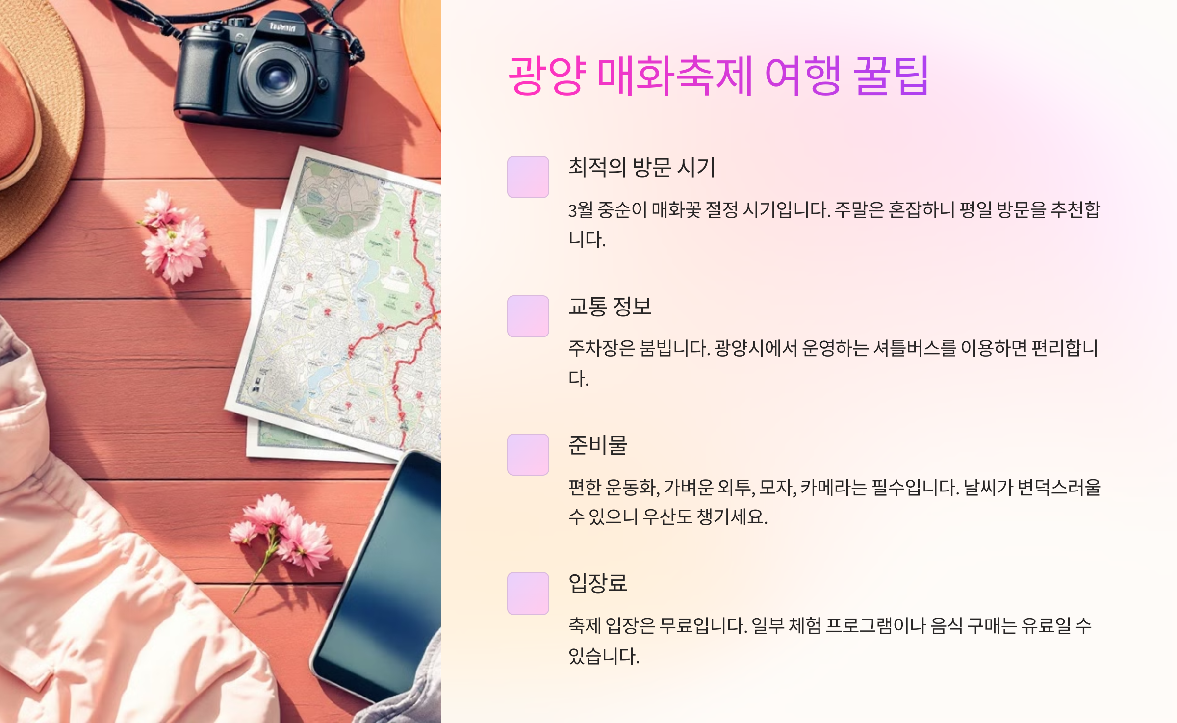 광양 매화축제를 더 알차게 즐기려면 몇 가지 여행 팁을 알고 가는 게 좋아. 축제 기간에는 많은 인파가 몰리기 때문에 미리 준비하면 훨씬 편하게 여행할 수 있어.