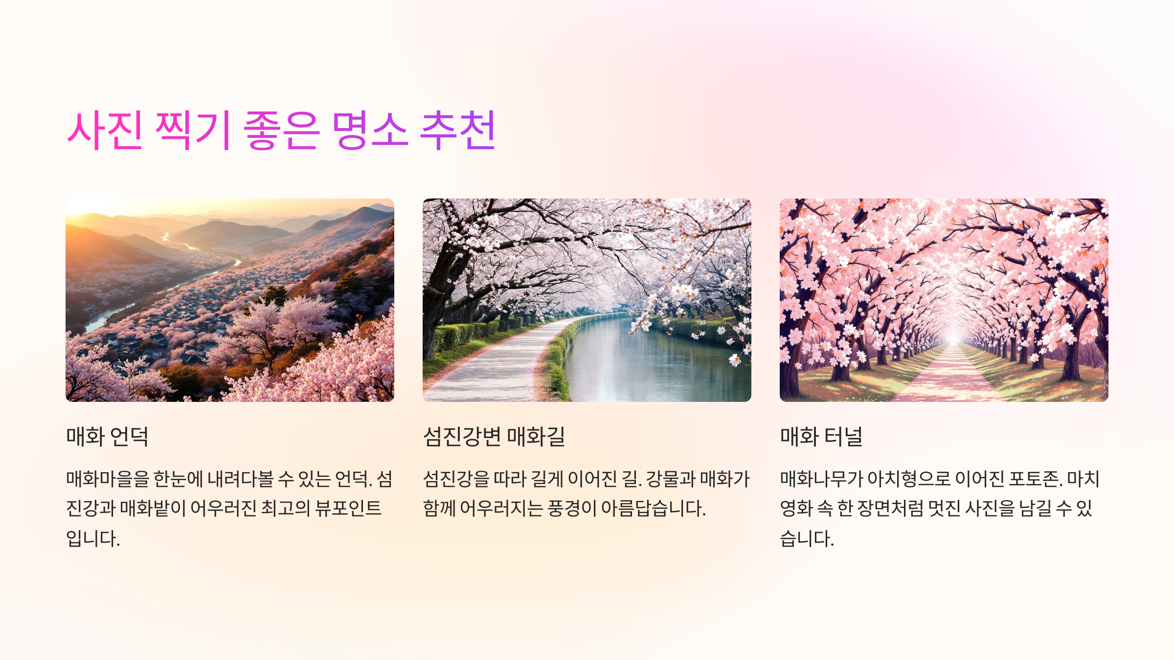 이 외에도 매화마을 곳곳에는 아름다운 포토존이 많아. 특히 매화꽃이 활짝 핀 나무 아래에서 촬영하면 마치 영화 속 한 장면처럼 멋진 사진을 남길 수 있어.