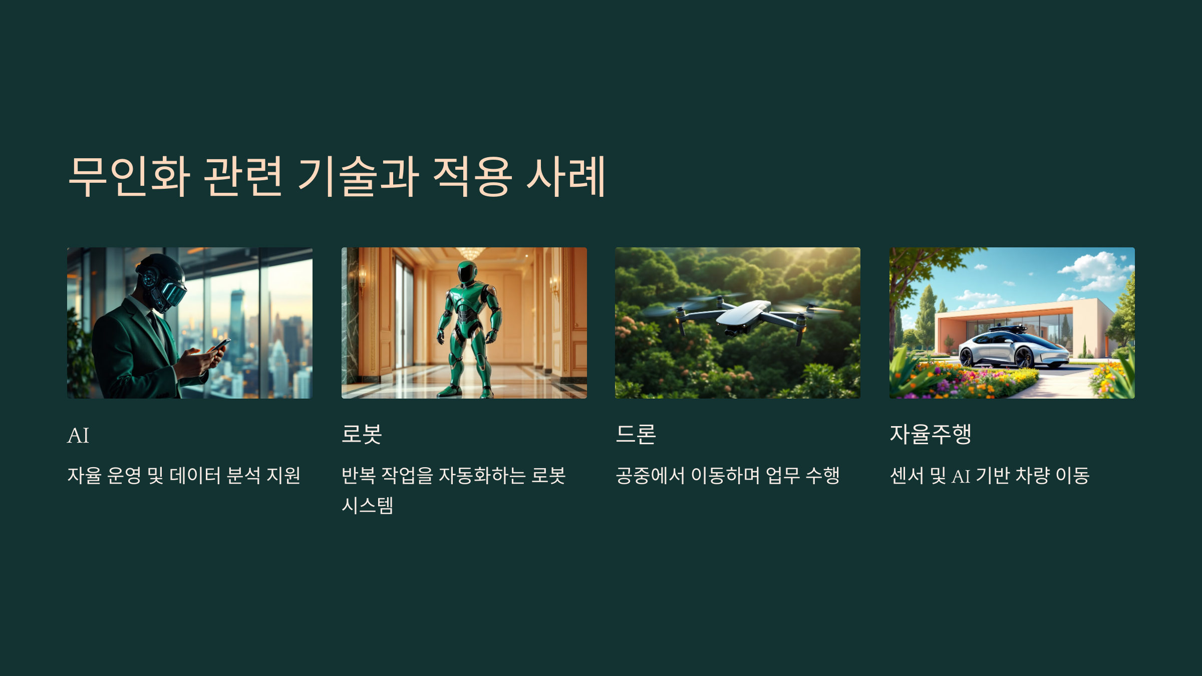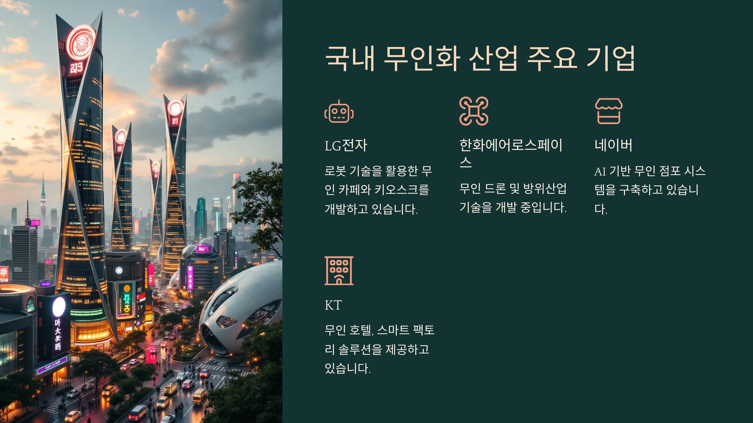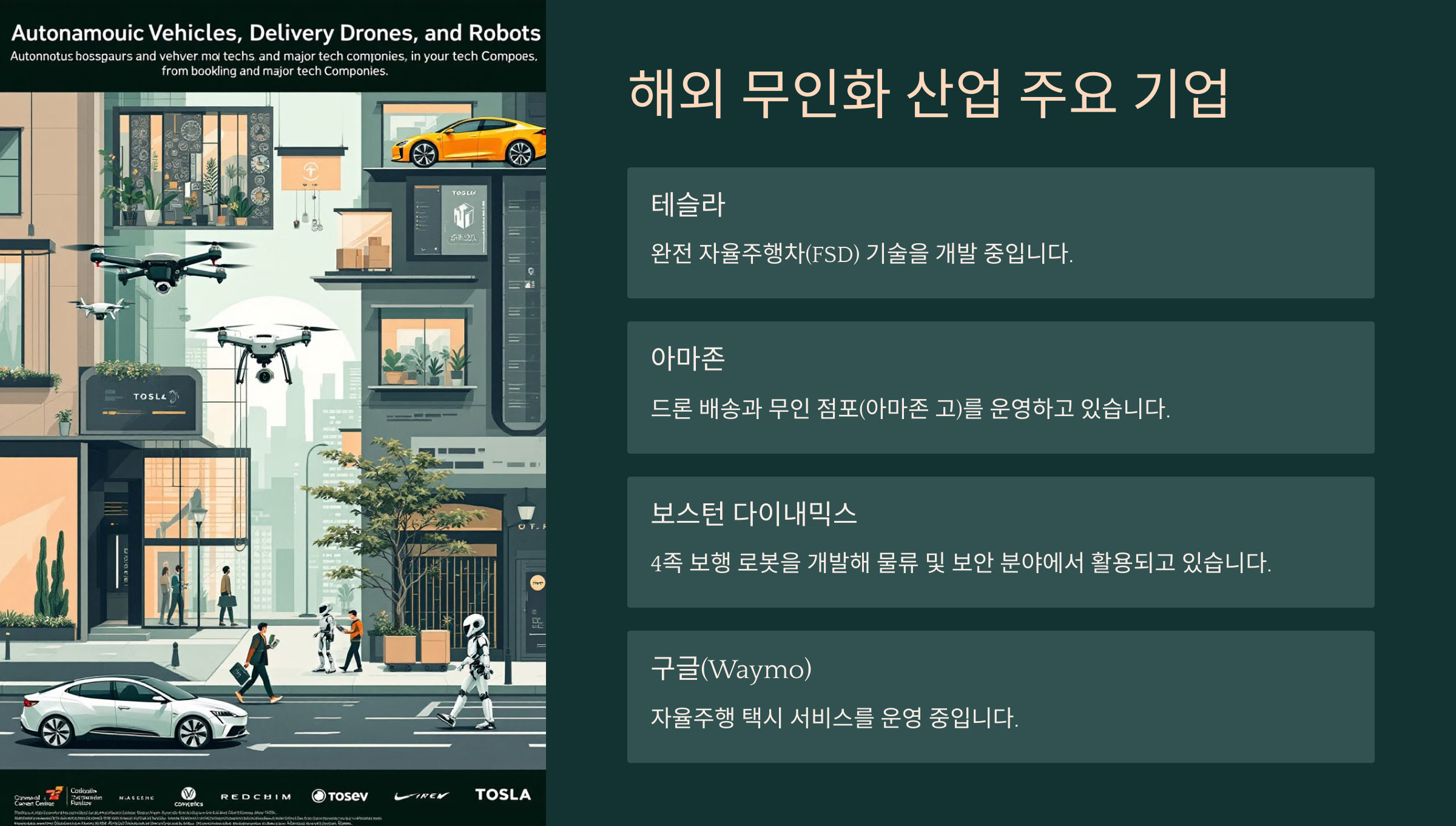예를 들어, **테슬라, 아마존, 구글 등은 무인화 산업에 적극적으로 투자하며 시장을 주도**하고 있고, 국내에서는 **LG전자, 한화에어로스페이스, 네이버, KT 등의 기업들이 무인화 기술을 개발**하며 성장을 이어가고 있죠.