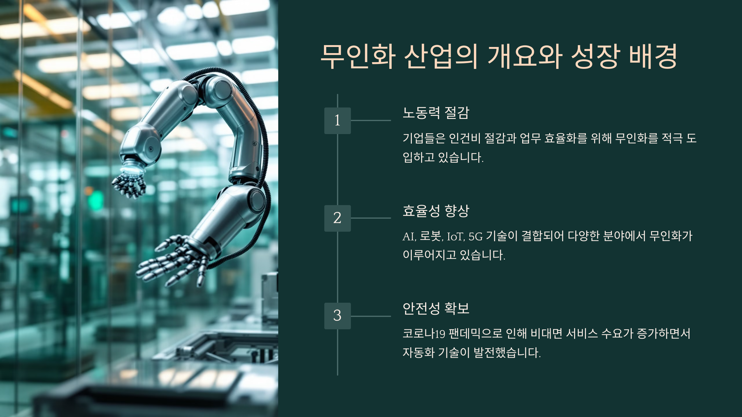 무인화 산업은 노동력 절감, 효율성 향상, 안전성 확보 등의 이유로 급성장하고 있어요. AI, 로봇, 사물인터넷(IoT), 5G 통신 기술이 결합되면서 다양한 분야에서 무인화가 이루어지고 있죠.
