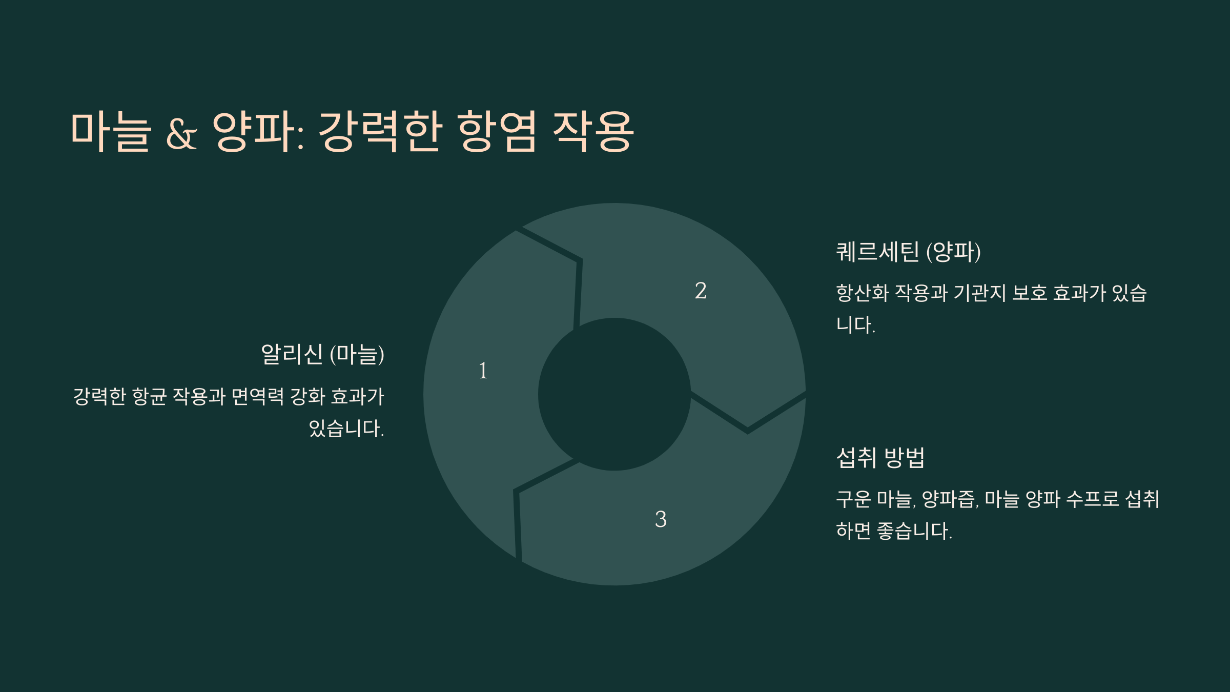 | 알리신 (마늘) | 강력한 항균 & 면역력 강화 | 생마늘, 마늘즙, 구운 마늘 |