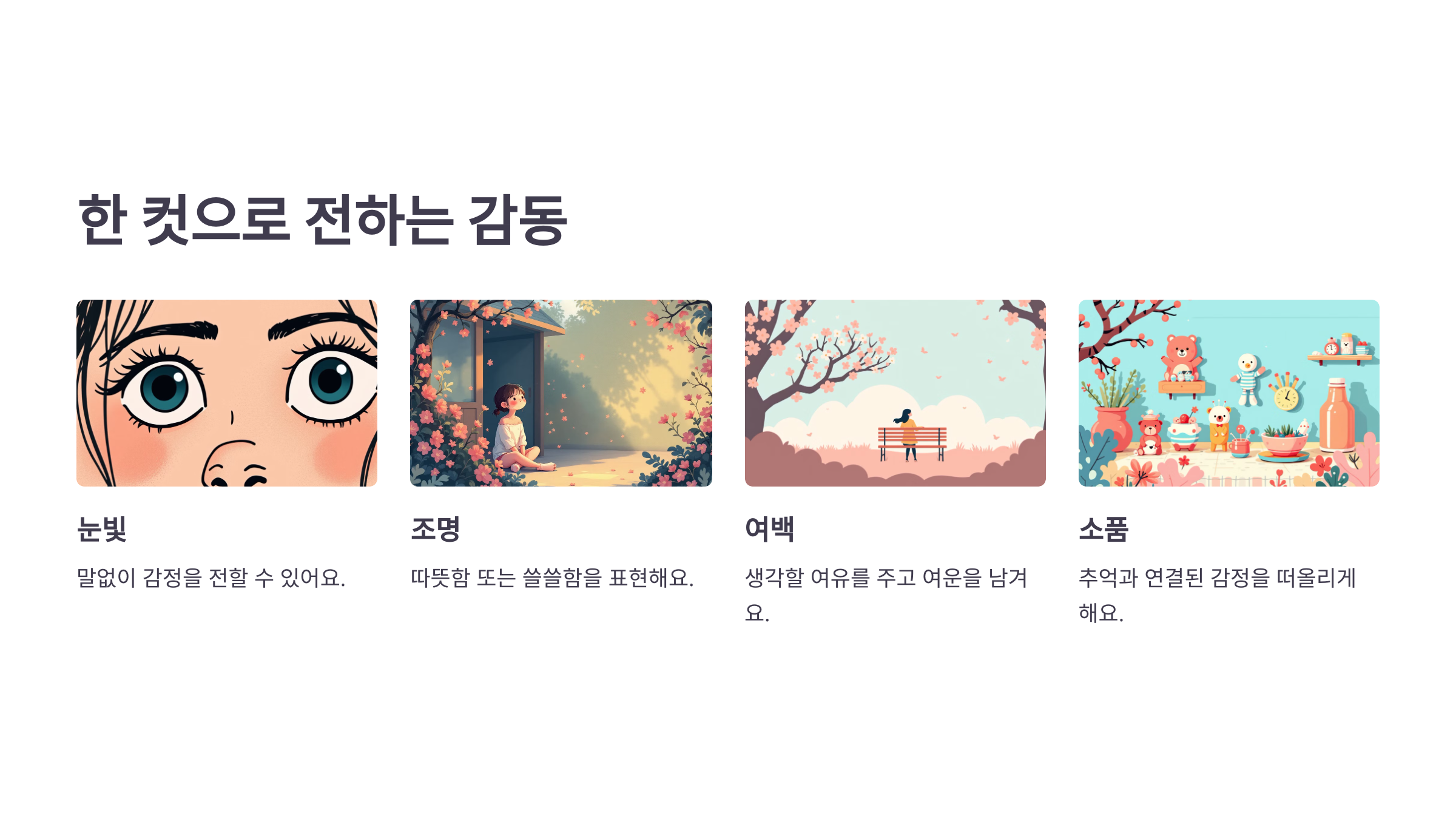 감동을 전하는 컷에는 흐르는 감정이 있어야 해요. 인물의 표정, 눈빛, 그려진 조명 방향, 그리고 공기의 느낌까지 표현될 수 있으면 최고의 한 장면이 돼요. 그 장면을 보는 순간, 이유 없이 울컥하게 되기도 해요.