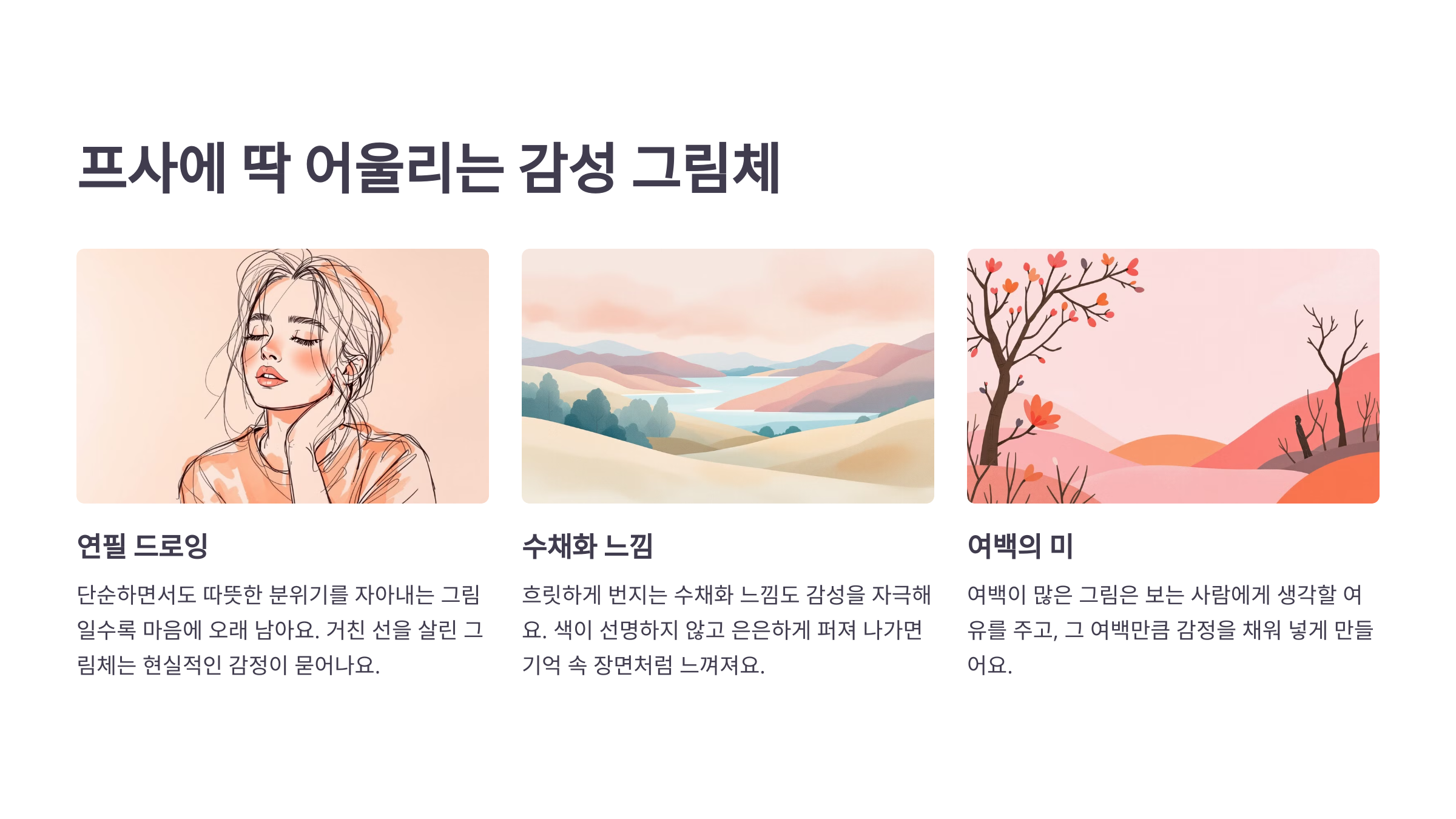 | 연필 드로잉 | 현실감, 거칠지만 따뜻함 |