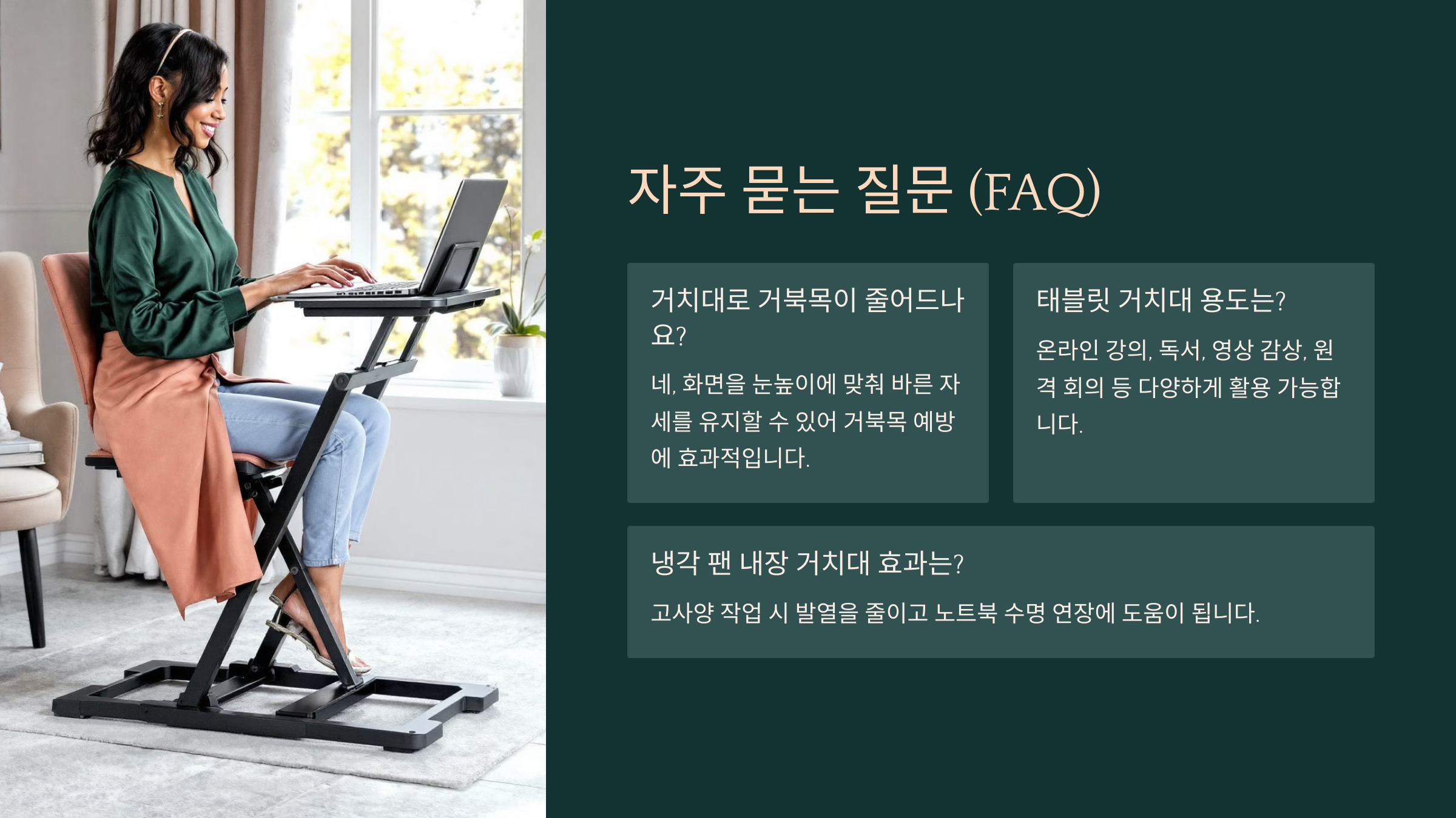 A1. 네! 거치대를 사용하면 화면을 눈높이에 맞출 수 있어 자연스럽게 바른 자세를 유지할 수 있어요. 거북목과 허리 통증 예방에 효과적이에요. 😊