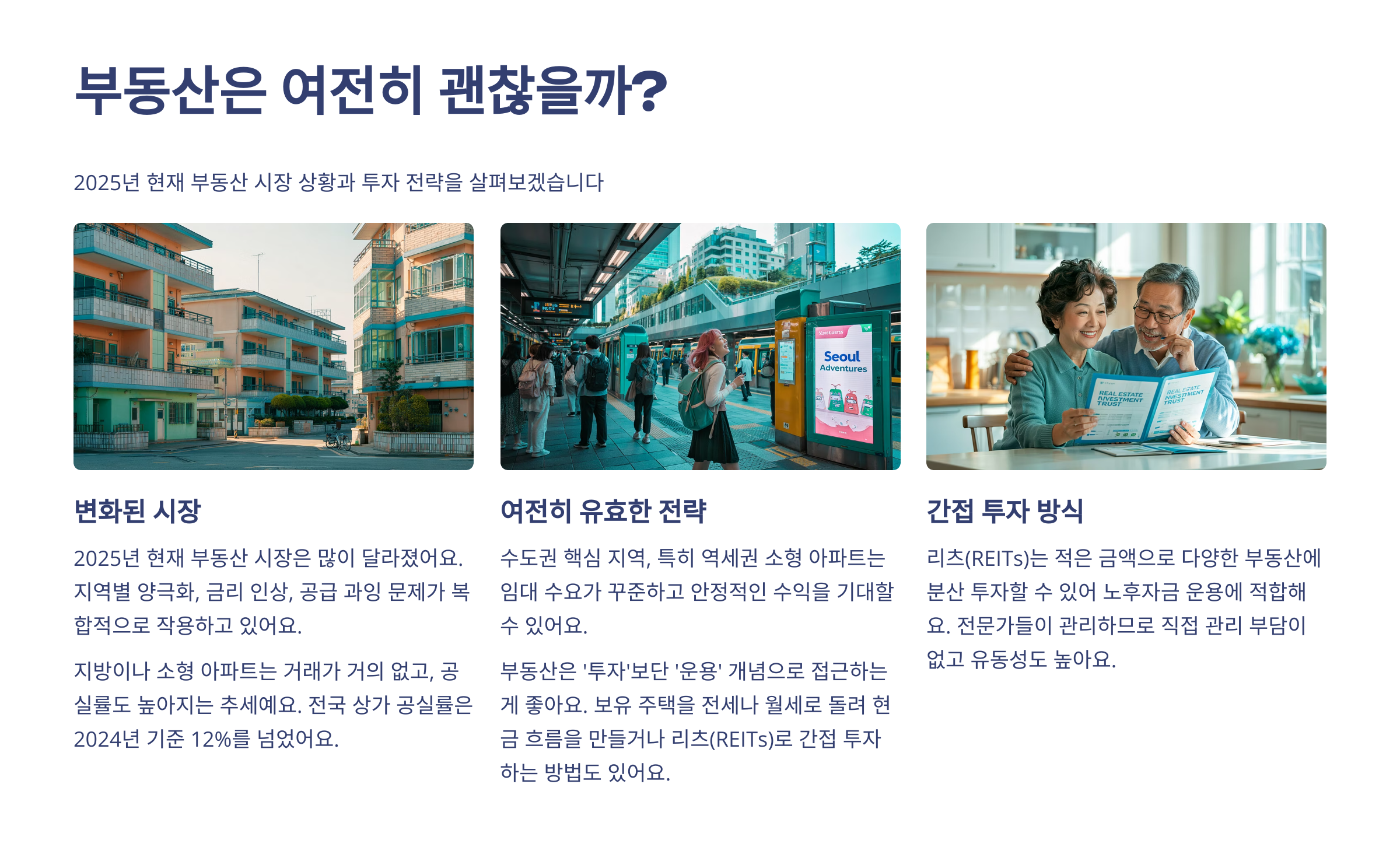 하지만 여전히 수도권 핵심 지역, 특히 역세권 소형 아파트는 임대 수요가 꾸준하고, 장기적으로 안정적인 수익을 기대할 수 있어요. 이런 지역은 노후 임대소득원으로 고려해볼 만해요. 단, 부동산도 유동성이 낮고 초기 투자금이 크다는 점을 꼭 인지해야 해요.