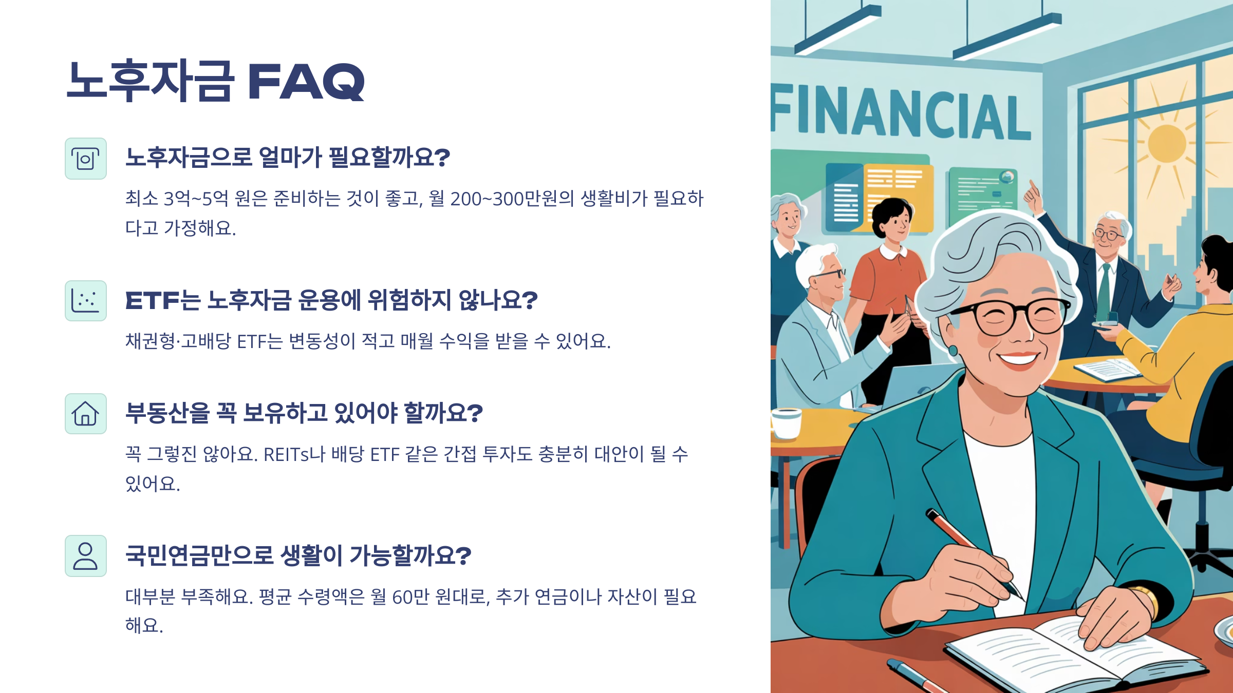 A1. 최소 3억~5억 원은 준비하는 것이 좋고, 평균 수명까지 월 200~300만원의 생활비가 필요하다고 가정해요.