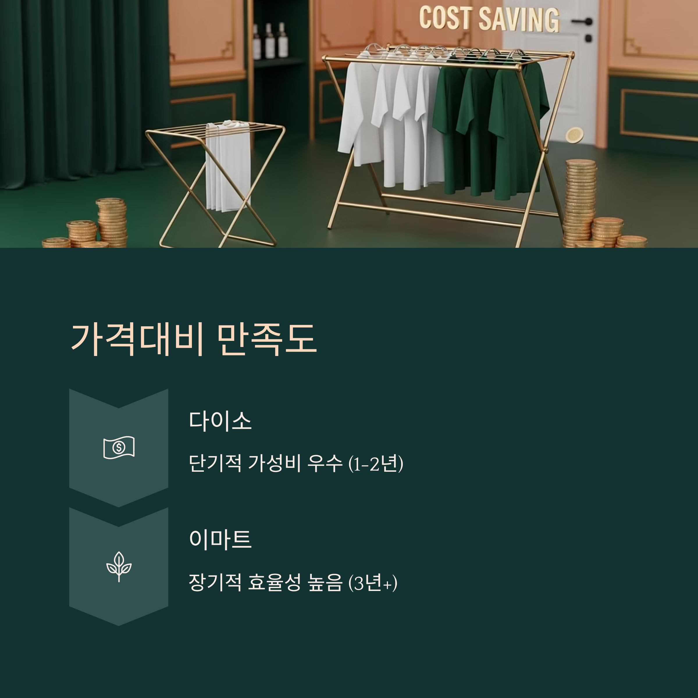 가벼운 빨래와 단기 사용을 고려한다면 다이소 제품이 합리적이에요. 그러나 고장률이나 불안정성을 감안하면 이마트 제품의 내구성은 그만한 값을 한다는 평가가 많아요.