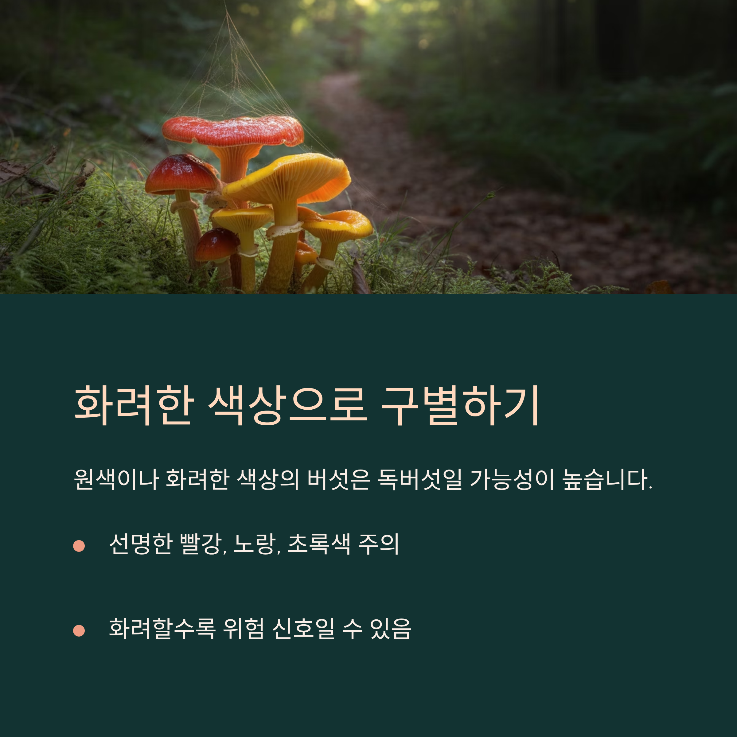 즉, 색이 원색이라고 무조건 독버섯은 아니지만, 원색이면 ‘의심부터 하자’는 마음으로 접근해야 해요. 특히 아이들과 산책할 땐 더더욱 주의가 필요해요.
