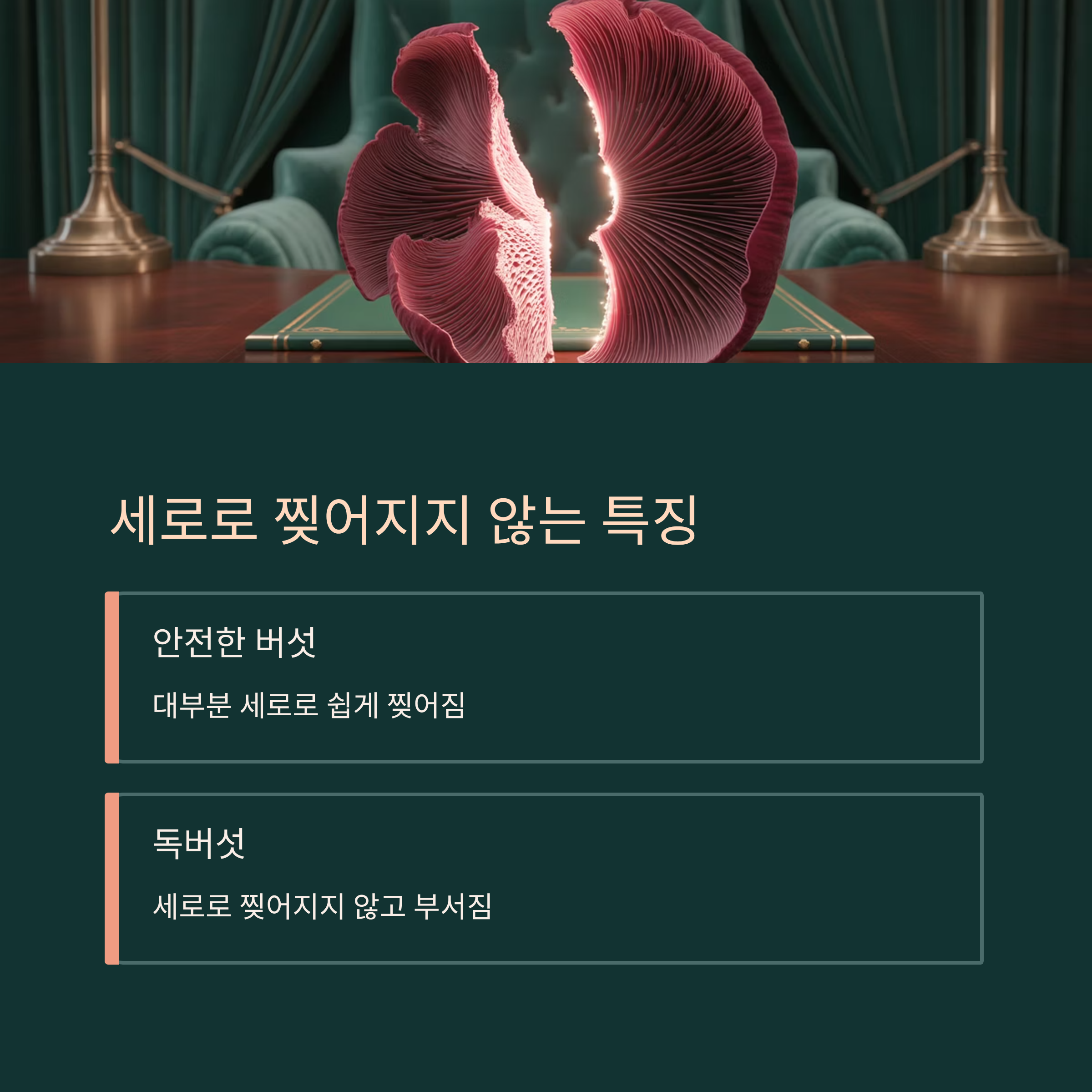 이 차이는 버섯의 조직 구조에서 비롯돼요. 식용버섯은 구조적으로 섬세하고 결이 살아 있어 ‘결따라’ 찢어지지만, 독버섯은 세포 구조가 치밀하고 결이 적어 물리적으로 세로 방향으로 분해하기 어려워요.