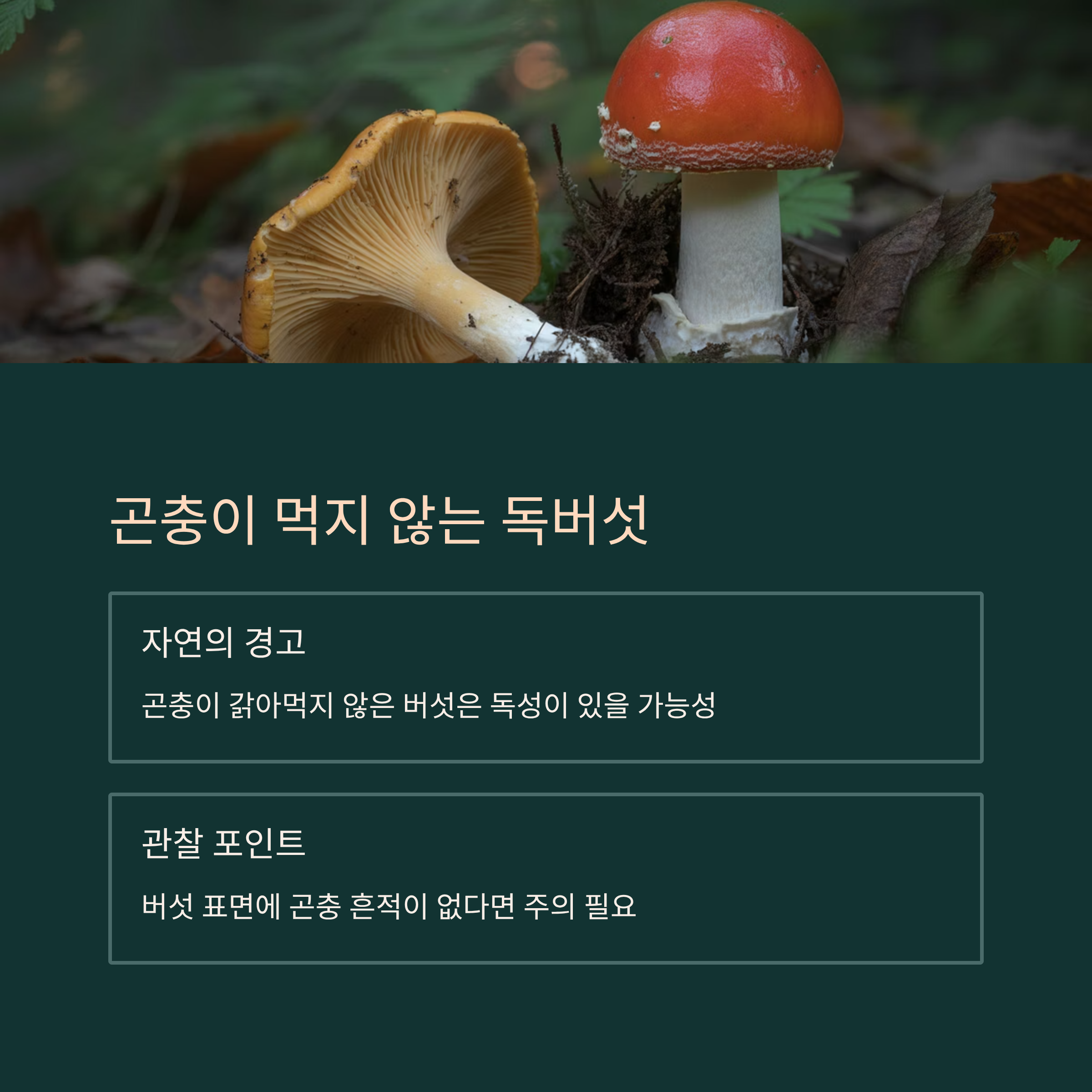 산이나 들에서 버섯을 발견했을 때, 누군가 “곤충이 안 먹으면 독버섯이야!”라고 말하는 걸 들어본 적 있을 거예요. 실제로 이 말은 과학적인 근거가 어느 정도 있어요. 곤충도 본능적으로 독이 있는 버섯은 피하려는 습성이 있거든요.