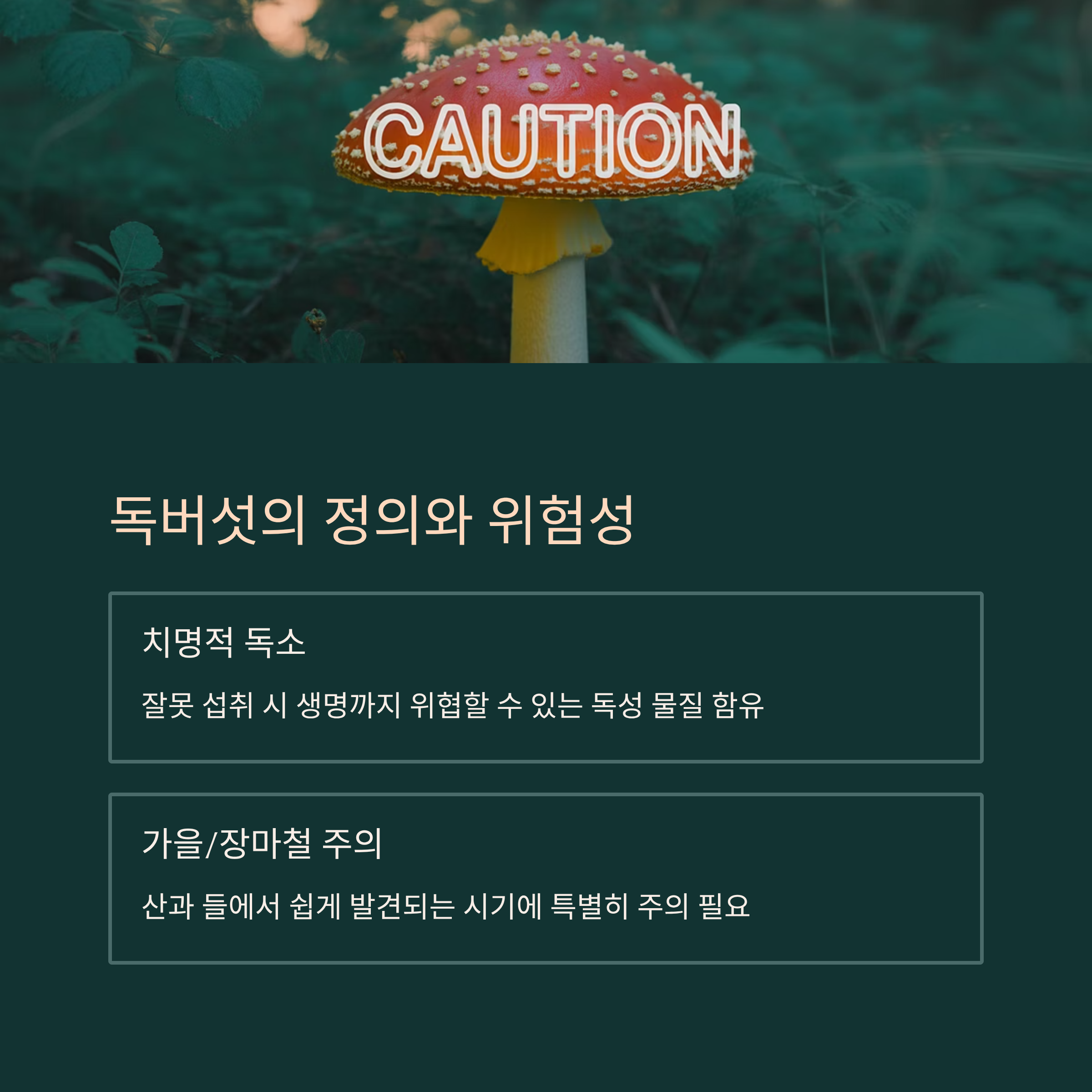 독버섯은 먹었을 때 인체에 유해한 독성 물질을 포함하고 있는 버섯이에요. 외형상 식용 버섯과 구별이 어려운 경우도 많아, 매년 많은 사람들이 중독되거나 심할 경우 목숨을 잃는 사고도 발생하고 있어요.