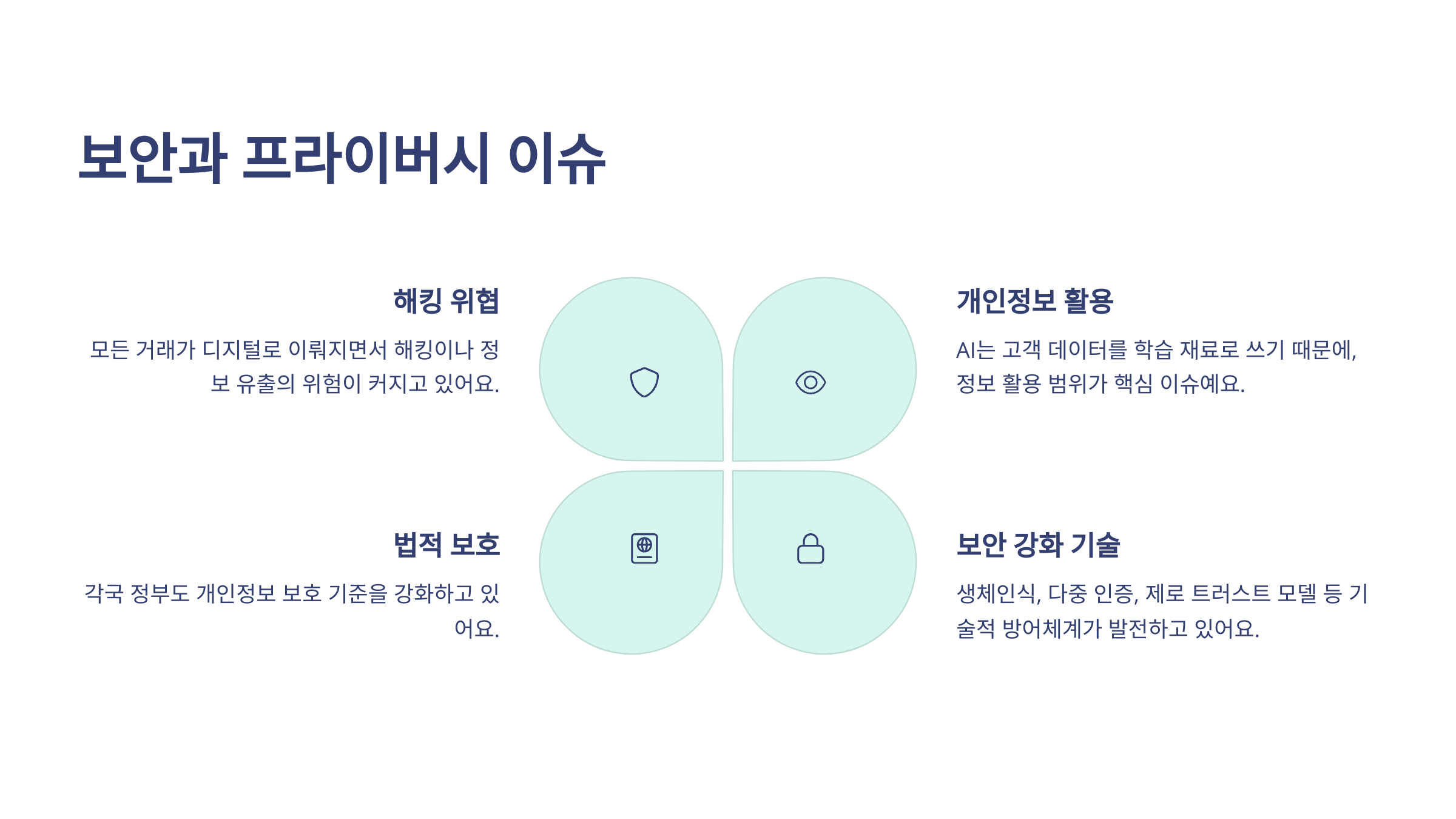 은행은 더는 '돈을 맡기는 곳'이 아니라, ‘데이터를 중심으로 개인의 삶을 설계해주는 플랫폼’이 되고 있어요. 다음은 이 모든 기술 변화 속에서 절대 빠질 수 없는 보안과 개인정보 이슈를 짚어볼게요