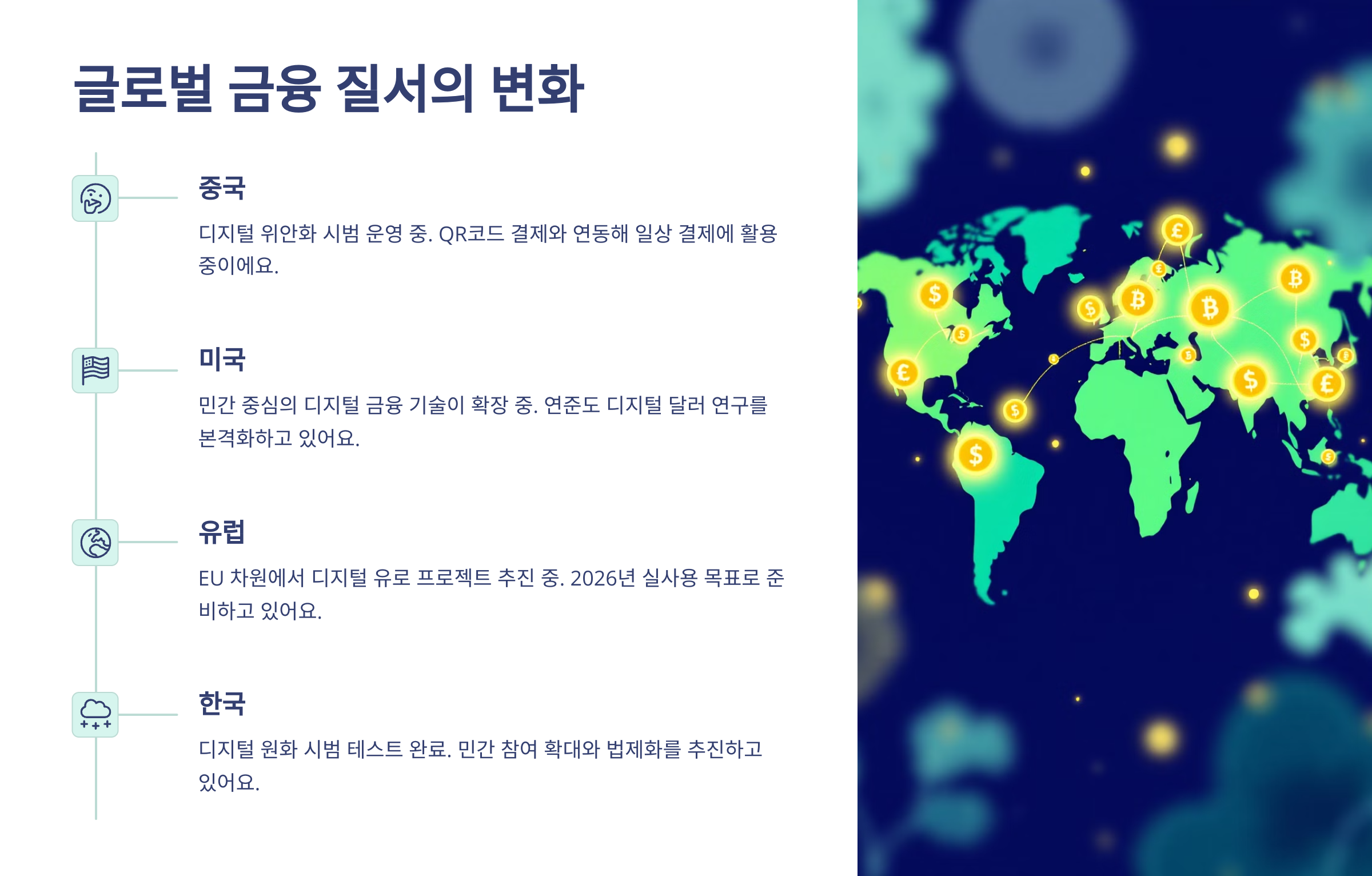 디지털 화폐와 AI는 단지 한 나라의 금융 시스템을 바꾸는 게 아니라, 세계 금융 질서 전체에 영향을 주고 있어요. 특히 주요 강대국들의 대응 방향이 국제 거래 시스템에 직접적인 영향을 주고 있죠