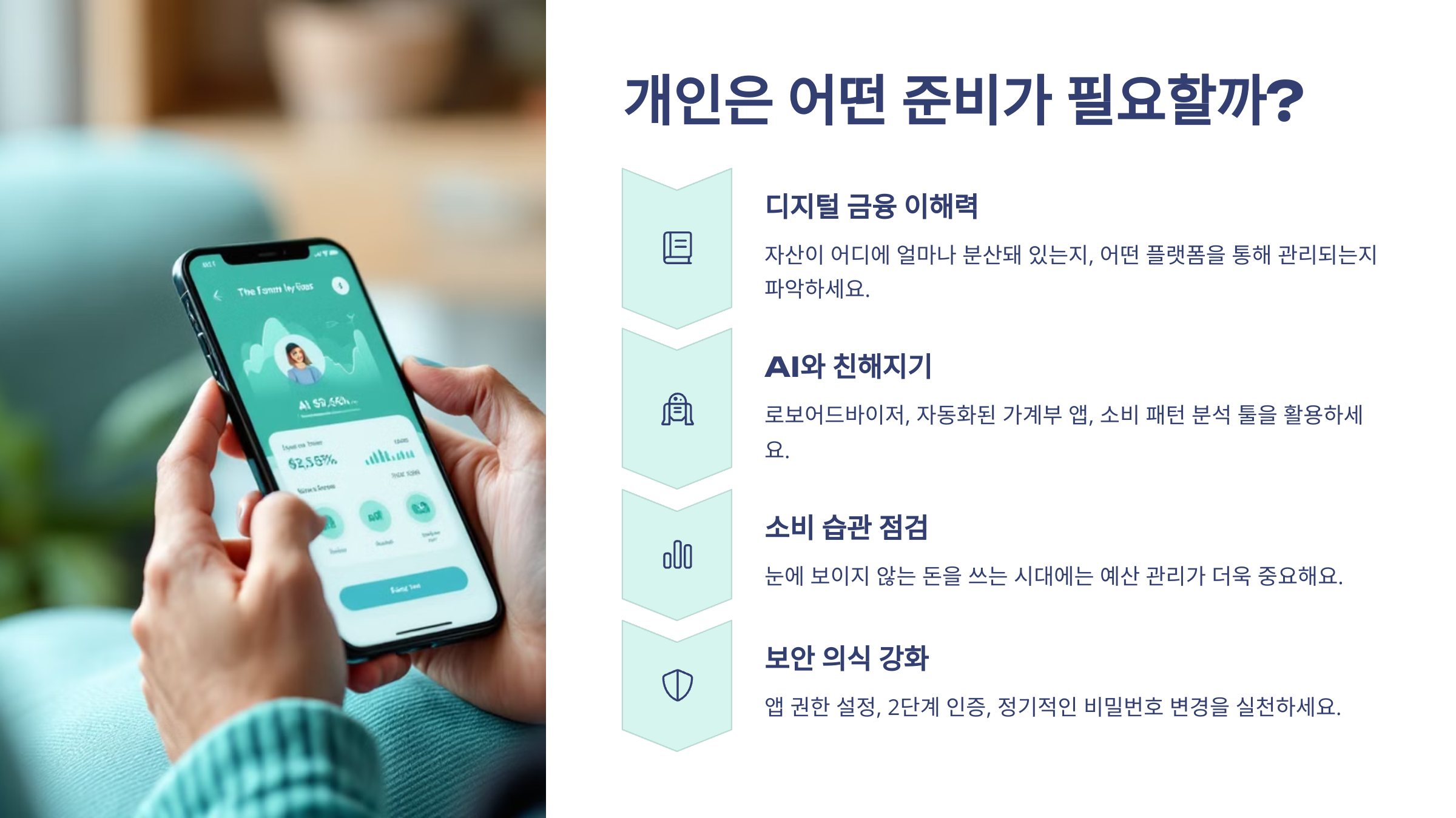 두 번째는 AI와 친해지기예요. 로보어드바이저, 자동화된 가계부 앱, 소비 패턴 분석 툴 등은 이제 일상적인 도구가 되었어요. 활용만 잘하면 나보다 나를 더 잘 아는 재정 조언자가 되어줘요
