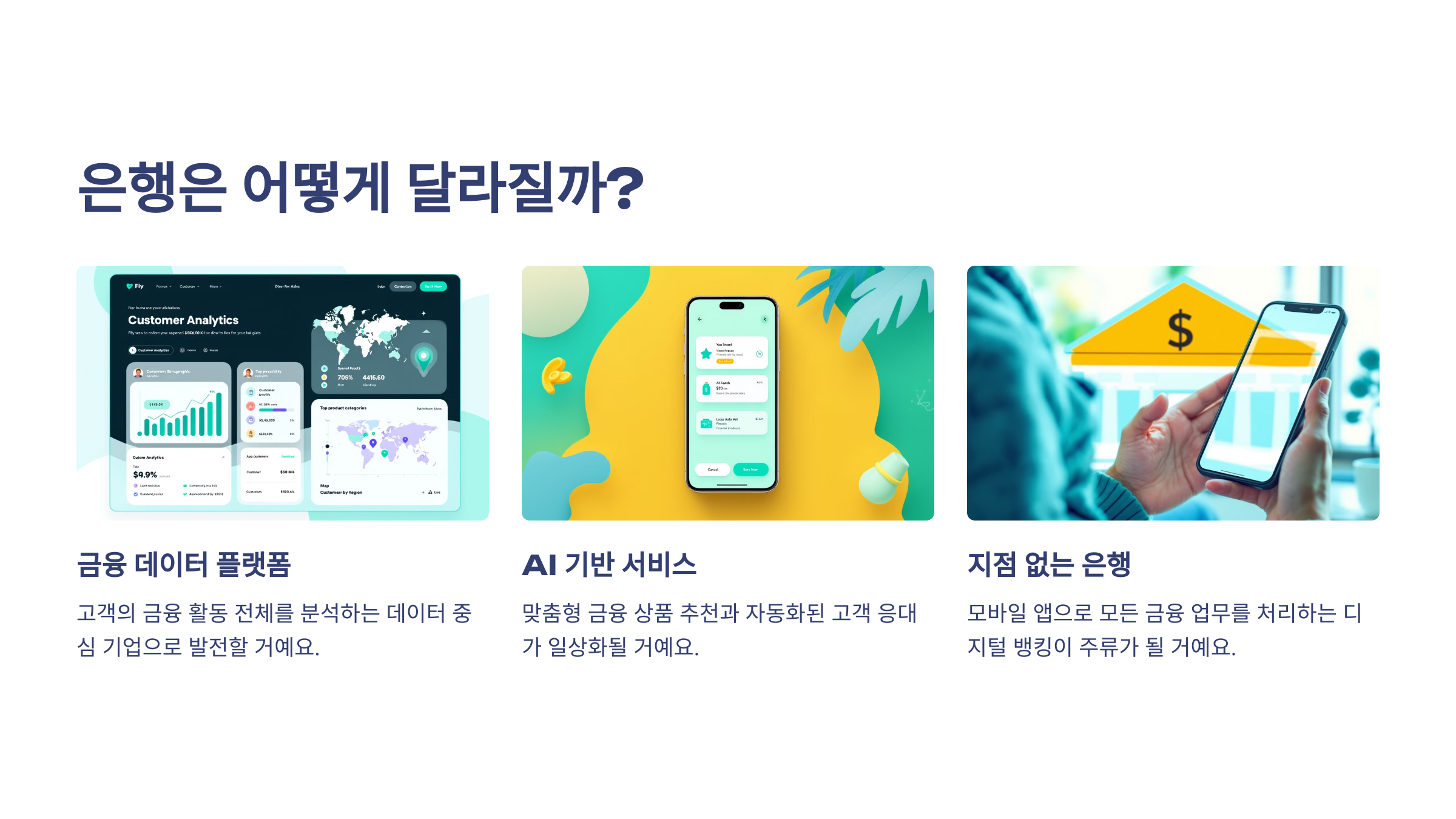 앞으로 은행은 점점 더 기술 중심의 기업으로 변할 거예요. 전통적 금융보다는 데이터 분석, UX 디자인, AI 모델링이 중요한 경쟁력이 될 거예요