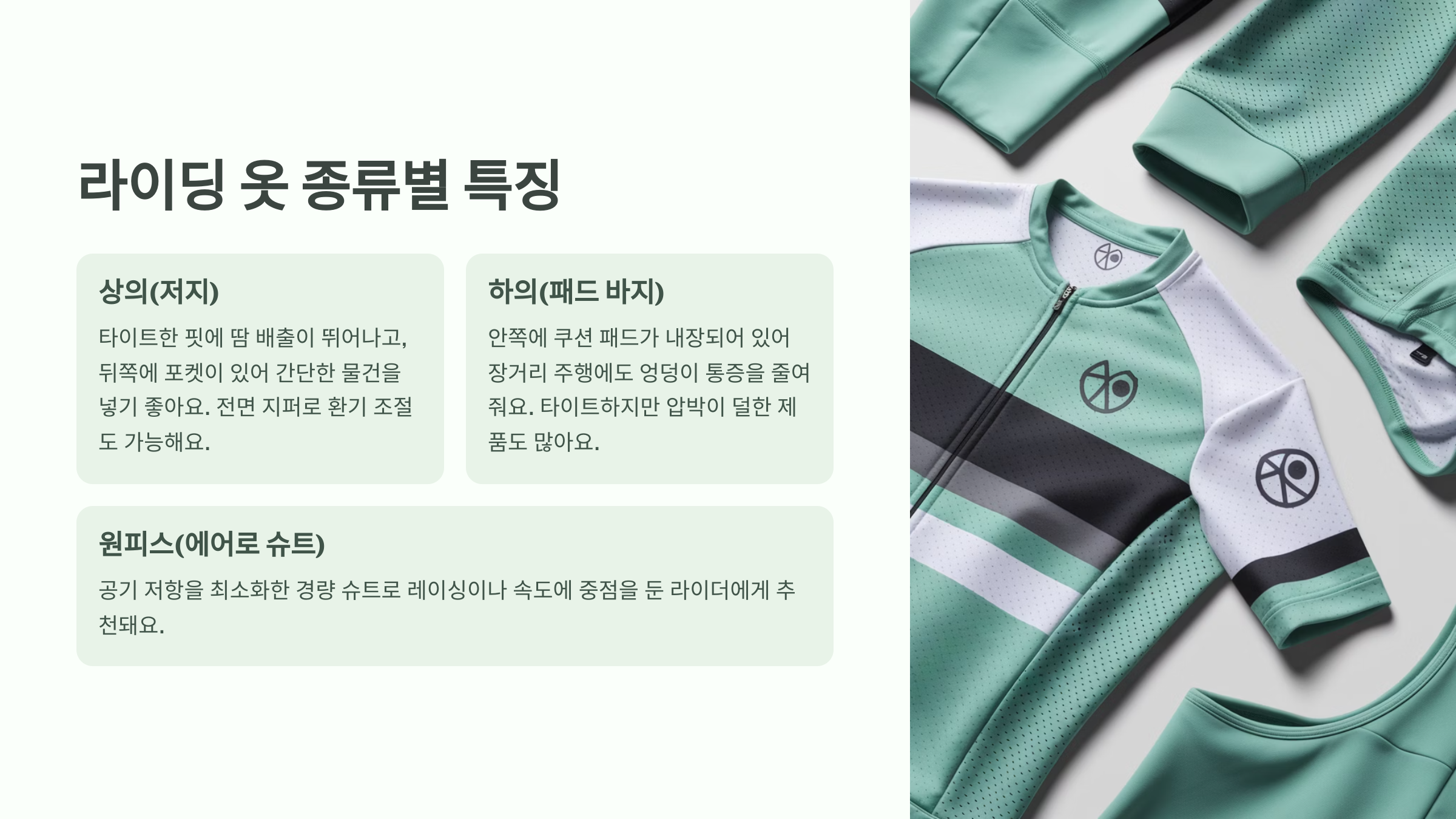 자전거복은 크게 상의, 하의, 원피스(슈트)로 나눌 수 있어요. 각각의 특징을 잘 이해하고 상황에 맞게 선택하는 게 중요해요.