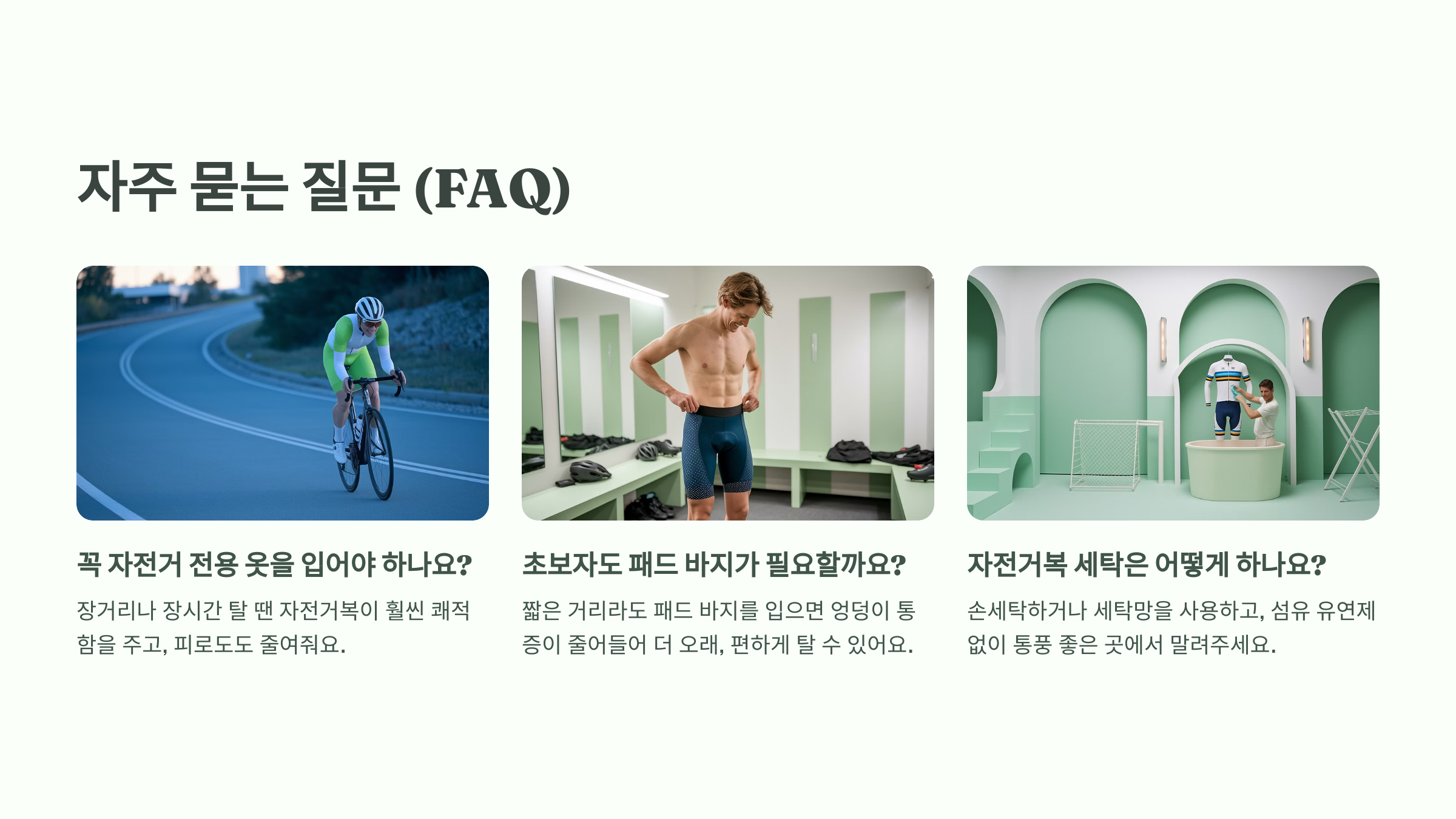 A1. 일반 운동복으로도 가능하지만 장거리나 장시간 라이딩 시 자전거복이 훨씬 쾌적하고 피로도도 줄여줘요.