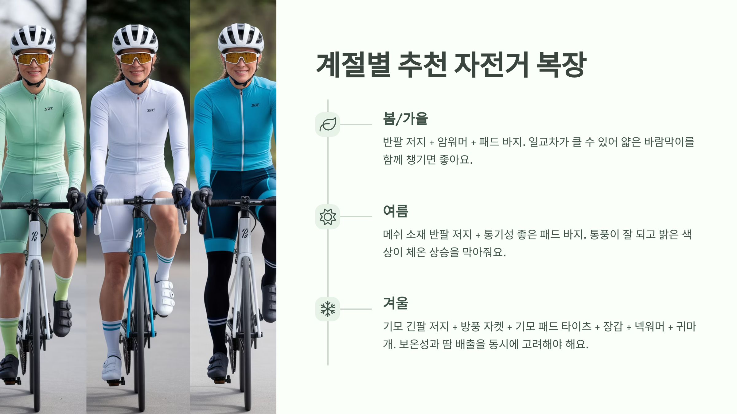 다음은 계절별로 어떤 자전거 옷을 입는 게 좋은지도 자세히 알려드릴게요! 🌤️