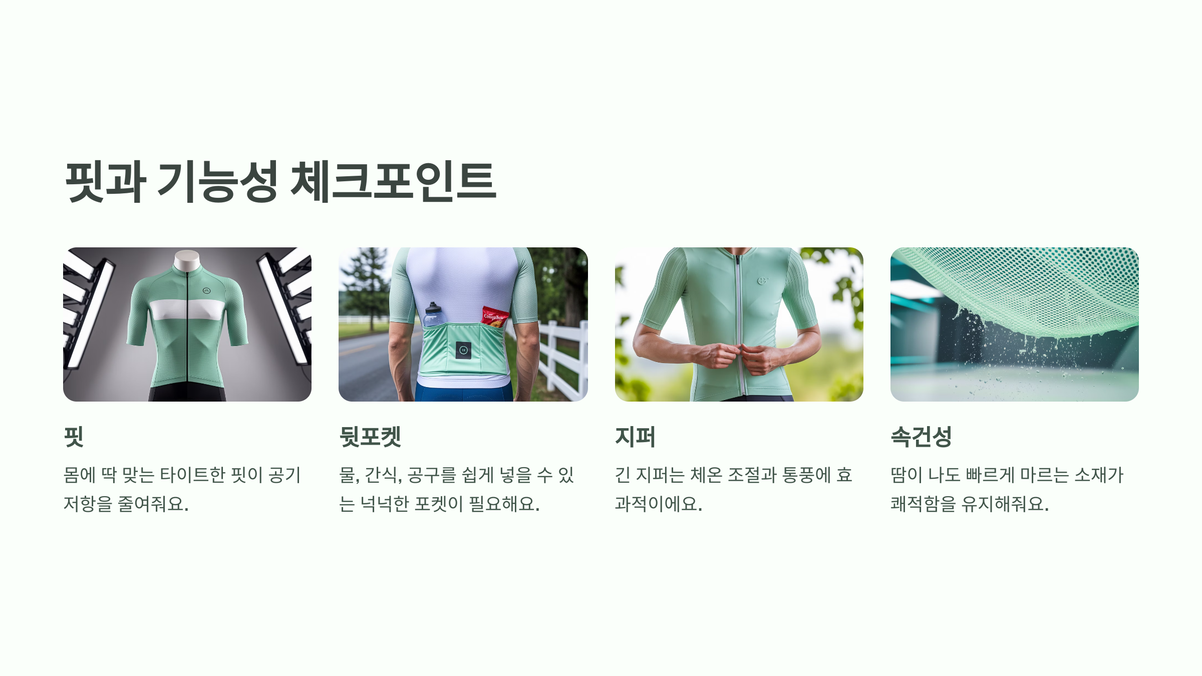 핏 외에도 꼭 체크해야 할 기능이 몇 가지 있어요. ▶ 뒷포켓 수: 물, 간식, 간단한 공구 등을 담을 수 있어야 해요. ▶ 지퍼 위치와 길이: 체온 조절이나 통풍에 중요해요. ▶ 반사 기능: 야간 주행 시 안전 확보에 필수! ▶ 속건성 원단: 땀 흘려도 금방 마르고 쾌적함을 유지해줘요.
