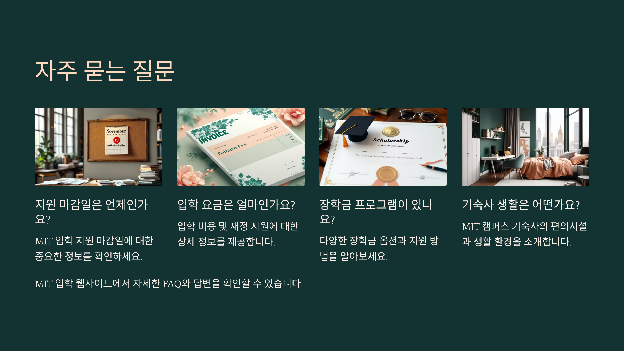 A1. MIT의 입학 경쟁률은 약 4~7%로 매우 높아요. 매년 약 20,000명이 지원하지만, 그중 소수만 합격하죠.