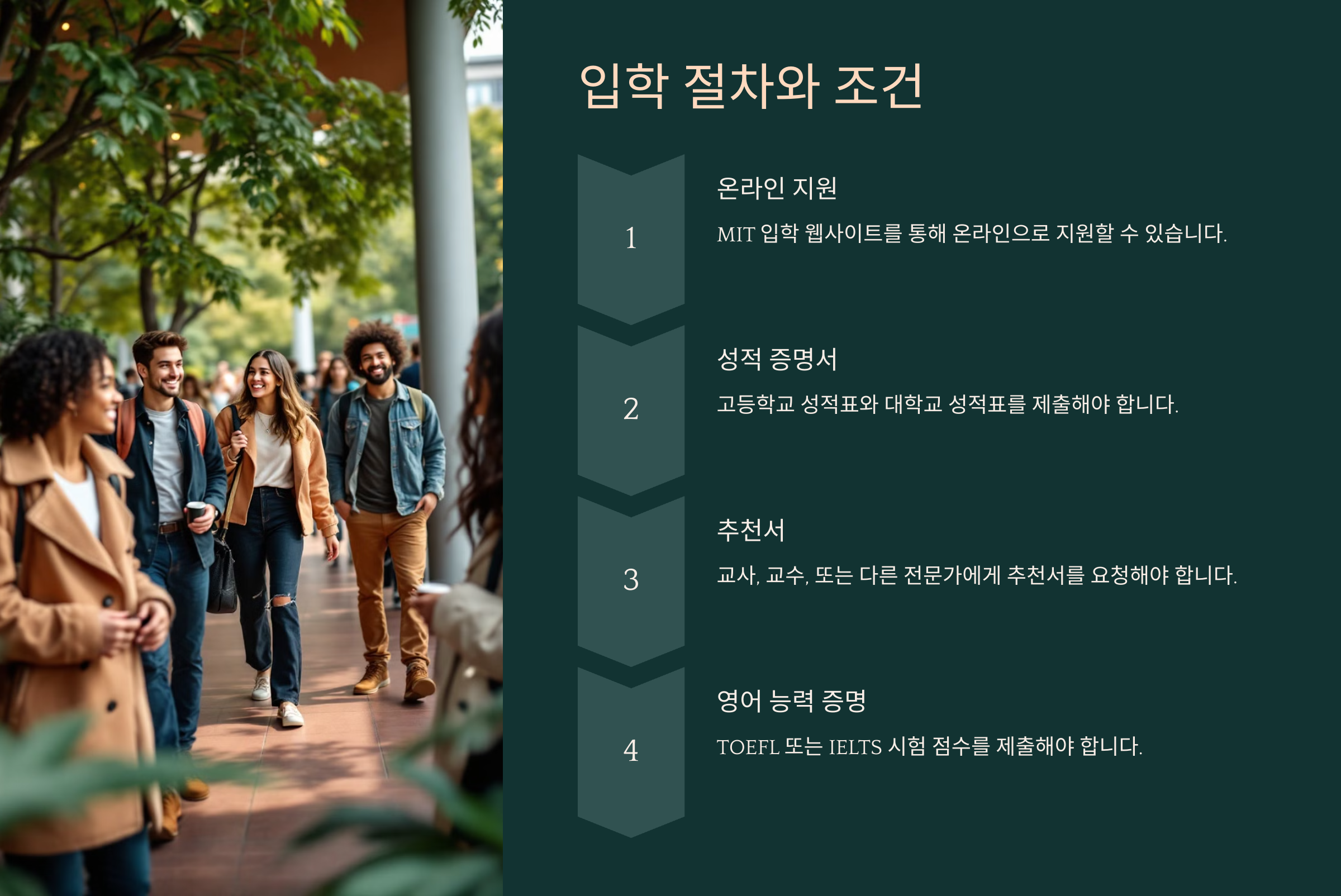 국제 학생도 MIT에 입학할 수 있는 기회가 많아요. 국제 학생 비율은 약 10%로, 세계 각지에서 다양한 배경을 가진 학생들이 함께 학문적 목표를 이루고 있어요.