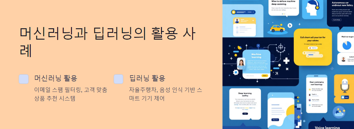 - 딥러닝: 이미지, 음성, 자연어와 같은 비정형 데이터를 처리하며, 자율주행차, 음성 비서 등에 활용됩니다.