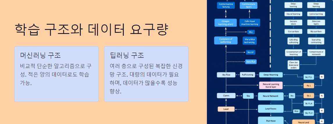 - 딥러닝: 여러 층(Layer)으로 구성된 복잡한 신경망 구조를 사용하여 더 높은 수준의 학습이 가능합니다.