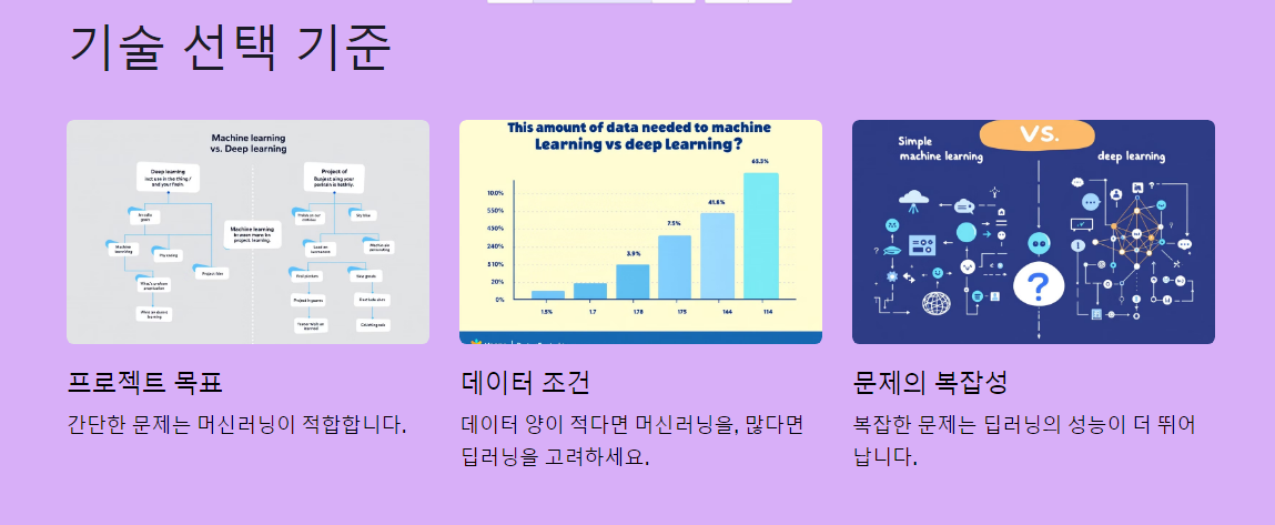 - 머신러닝: 적은 양의 데이터로도 학습이 가능합니다. 따라서 초기 단계에서 빠른 적용이 용이합니다.