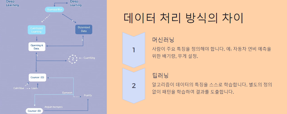 - 머신러닝: 데이터를 분석하기 위해 사람이 주요 특징(Feature)을 정의해야 합니다. 예를 들어, 자동차의 연비를 예측하려면 배기량, 무게 등의 특징을 미리 설정해야 합니다.
