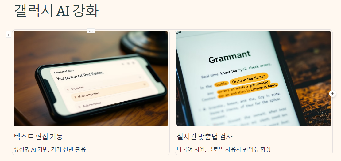 One UI 7은 AI에 최적화된 프레임워크를 기반으로 한 갤럭시 AI 기능을 제공합니다. 특히 생성형 AI 기반의 텍스트 편집 기능이 프레임워크 단에서 통합 지원되어 기기 전반에서 쉽게 활용 가능합니다.