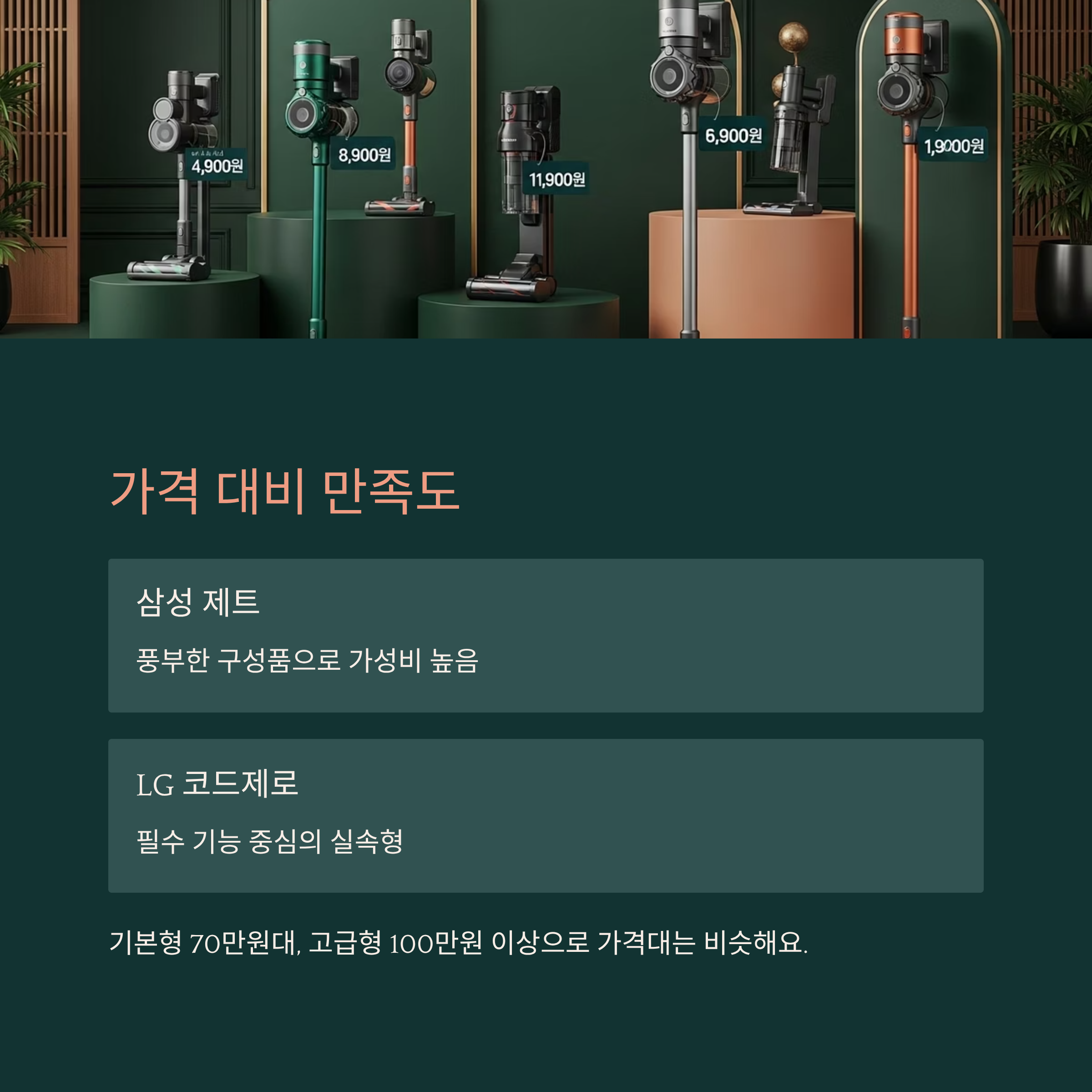 삼성과 LG의 무선청소기는 모두 프리미엄급으로 분류되기 때문에 가격대는 대체로 비슷해요. 기본형 모델은 70만 원대부터 시작하고, 고급형은 100만 원 이상으로 올라가죠. 하지만 실제 사용 후 만족도는 단순히 가격만으로 결정되진 않아요.
