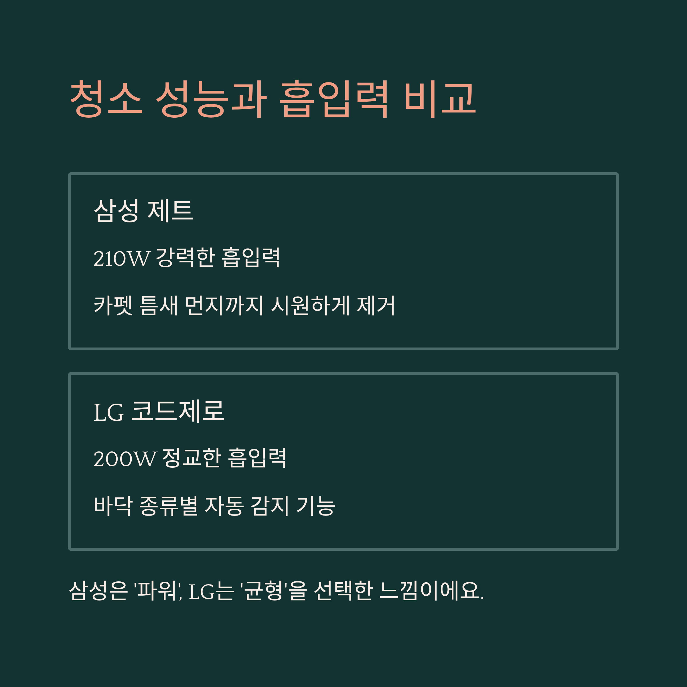 내가 생각했을 때, 흡입력만 놓고 보면 삼성에 점수를 주고 싶지만, 청소 소리나 부드러운 이동성을 고려하면 LG도 절대 뒤지지 않아요. 사용 환경에 따라 선택지가 갈리는 포인트예요.